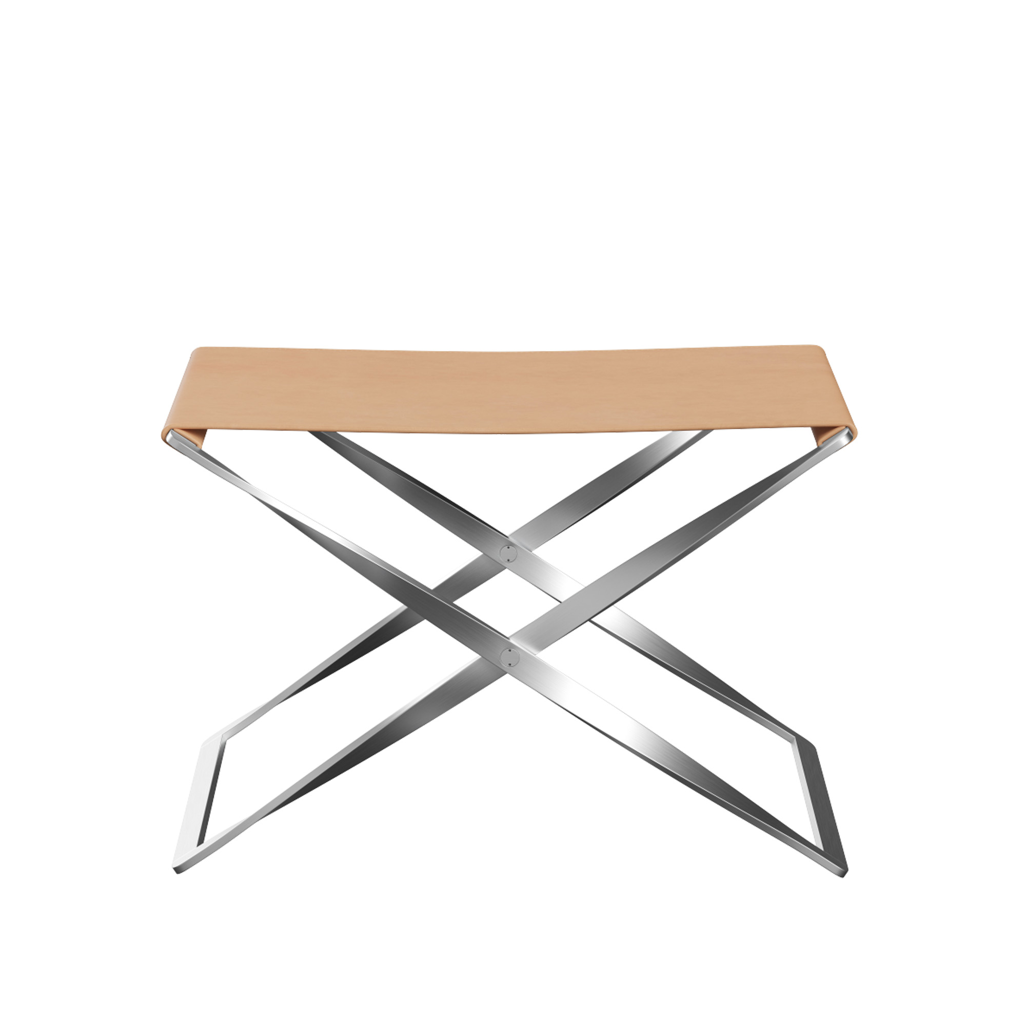 PK91 är en stilfull hopfällbar pall, skapad av designern Poul Kjærholm för Fritz Hansen 1961. Denna pall utmärker sig med sin minimalistiska stil, där sitsen, som kan vara gjord av canvas eller läder, är monterad på ett korsformat ställ av satinborstat, rostfritt stål. Sitsen erbjuds i ett urval av färgalternativ.