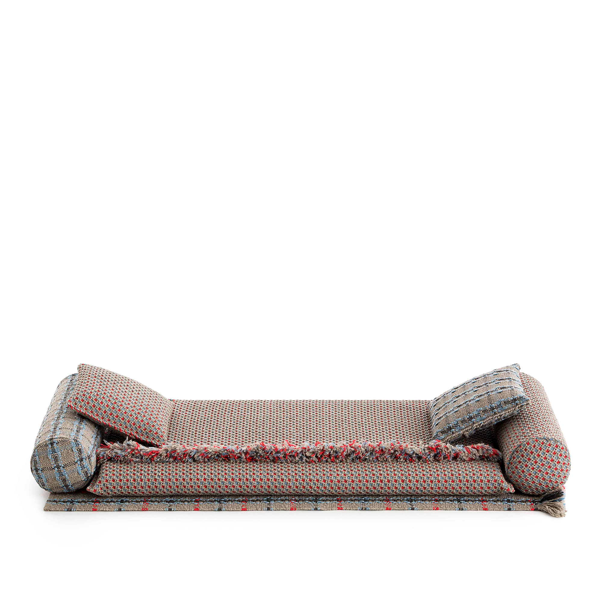 Garden Layers Composition 05 är en samling av utomhuselement designade av Patricia Urquiola för det spanska varumärket GAN. Dessa avkopplande utomhusmöbler är perfekta för att förhöja stämningen på din terrass eller balkong. Kollektionen presenteras i en palett av tre nyanser och inkluderar en matta, en madrass, två runda kuddar och två fyrkantiga kuddar. Garden Layers Composition 05 erbjuder en inbjudande plats för vila med sin bohemiska charm. Alla delar i denna kollektion är framställda av polypropen, vilket ger både komfort och praktisk användning. Kuddarna är stoppade med skumgummi som har den fördelen att de torkar fort efter att ha blivit våta. Detta arrangemang är en del av GAN:s Garden Layers-serie. Det är viktigt att notera att detta paket är bara ett exempel på hur man kan kombinera de olika elementen i serien. Inom Garden Layers finns det ett brett utbud av produkter i olika storlekar, alla med samma orientaliska design. Patricia Urquiola hämtade inspiration till Garden Layers under sina resor i Indien, där hon fascinerades av den antika arkitekturen från det historiska Mughal-imperiet.