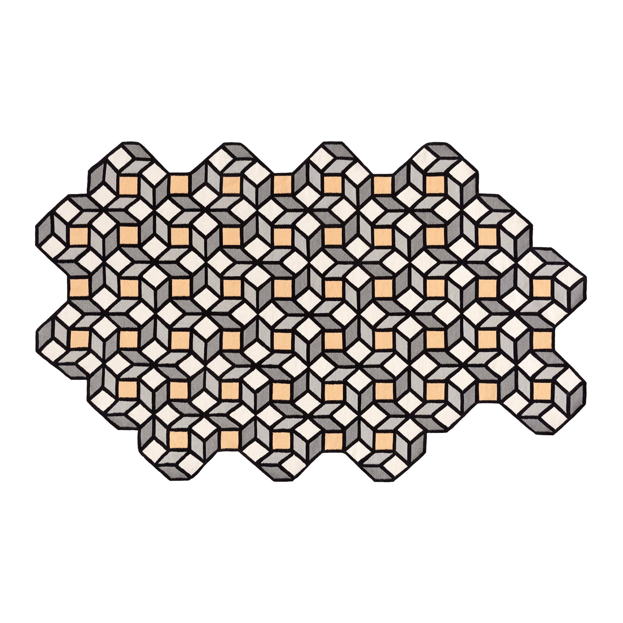 Parquet Rhomb Rug är formgiven av den svenska designduon Front, för Gan Rugs. Med sin expertis har duon kombinerat traditionella mönster och geometrier från golv och mattor, med nya former och färger, vilket har resulterat i en kollektion av kelimmattor med en modern tredimensionell känsla. Mattorna i Parquet-serien, Tetragon, Rhomb och Hexagon är alla uppbyggda i block av geometriska figurer med fyra till åtta sidor och deras oregelbundna former skiljer sig starkt från den traditionella mattans rektangulära form. Mattorna är vävda helt för hand, är tillverkade i ull och är dessutom vändbara. Designen och färgen på mattorna skapar nya dimensioner i ett rum, då det gör att utrymmet känns större och utmanar det traditionella med sitt moderna uttryck. Rhomb antar en mer organisk form än de andra mattorna i kollektionen och har en något lugnare känsla över sig med sina sobra gula, gråa och vita färgtoner.