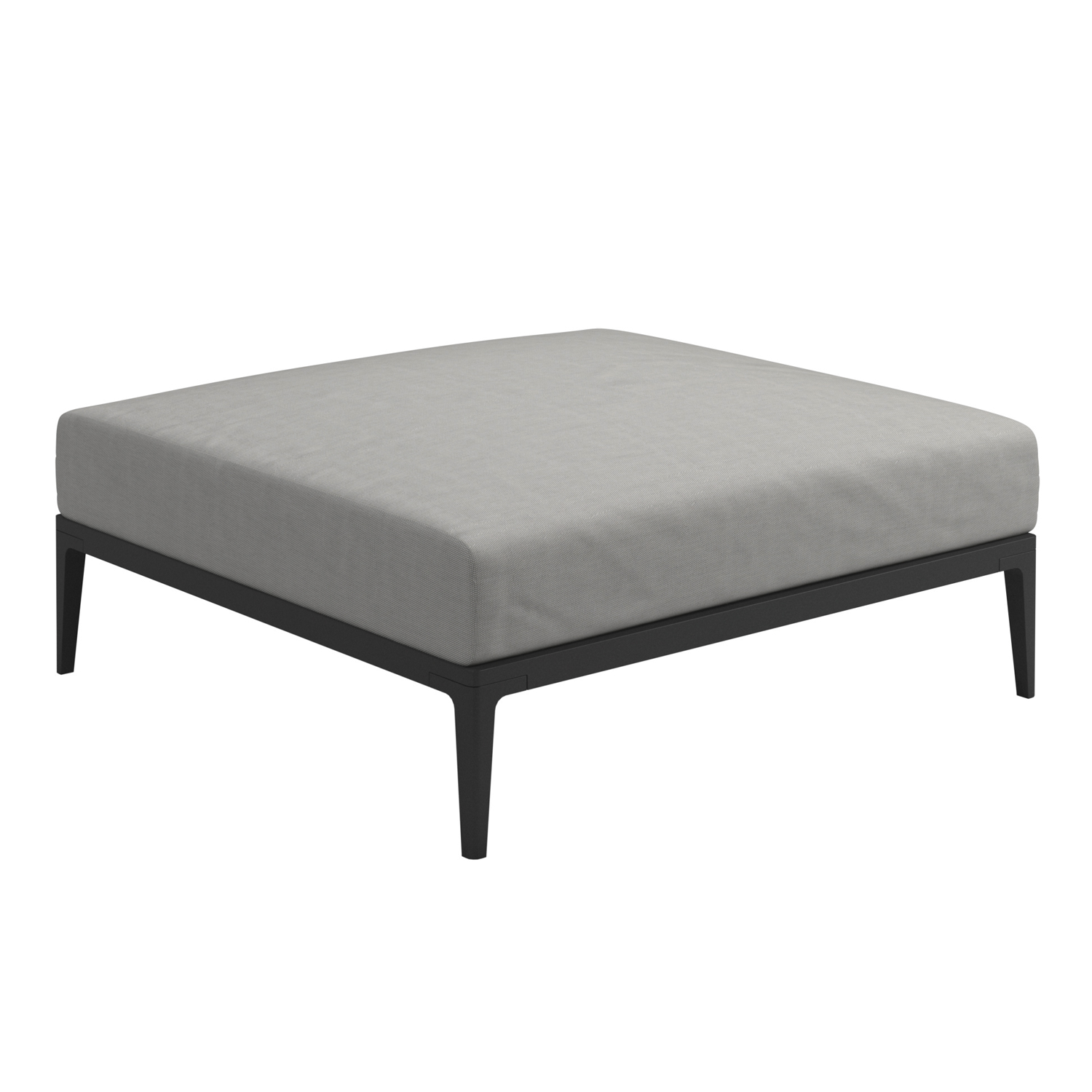 Fotpall Grid Lounge Ottoman från Gloster. Grid är en serie loungemöbler av absolut högsta kvalitet avsedda för utomhusbruk. Grid, med sina olika moduler, erbjuder stor flexibilitet och möjligheten av skapa en sittgrupp som passar alla tänkbara behov. Möblernas ramar är tillverkade av pulverlackerad aluminium, välj mellan färgerna Meteor och White. Dynor och kuddar är klädda med tyget Outdoor Lounge. Denna textil är mycket väderbeständig och tål stora mängder vatten.