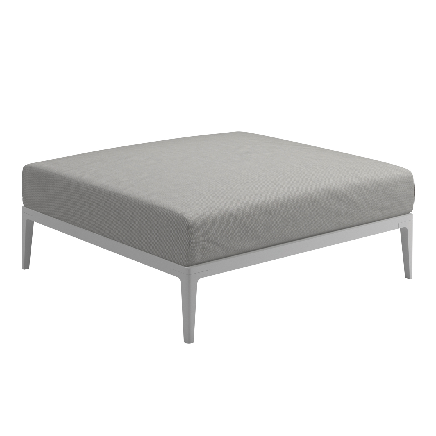 Fotpall Grid Lounge Ottoman från Gloster. Grid är en serie loungemöbler av absolut högsta kvalitet avsedda för utomhusbruk. Grid, med sina olika moduler, erbjuder stor flexibilitet och möjligheten av skapa en sittgrupp som passar alla tänkbara behov. Möblernas ramar är tillverkade av pulverlackerad aluminium, välj mellan färgerna Meteor och White. Dynor och kuddar är klädda med tyget Outdoor Lounge. Denna textil är mycket väderbeständig och tål stora mängder vatten.