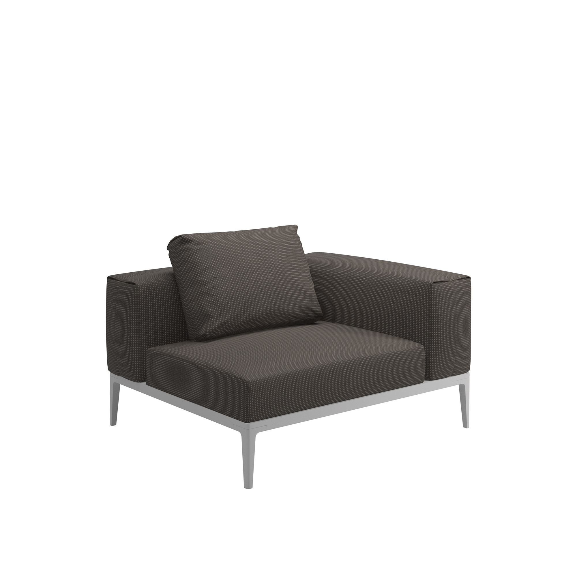 Glosters Grid Small Corner Unit är en modulär soffa skapad av den erkända danska designern Henrik Pedersen. Denna möbel utmärker sig med sina rena linjer och skapar en känsla av rymd, mycket tack vare dess eleganta och smäckra benställning tillverkad i aluminium, tillgänglig i antingen Meteor-färg eller i klassiskt vitt. Grid Small Center Unit kännetecknas av sitt låga ryggstöd och en bekväm dyna gjord för utomhusbruk, tillverkad i ett material som tål väder och vind. Denna enhet är utformad för att fungera som en hörndel, men den är också perfekt som en enskild möbel eller i kombination med andra delar från Grid-serien. Det högkvalitativa tyget är designat för att vara hållbart och motståndskraftigt mot fukt och blekning från solens strålar. Om du är intresserad av att beställa ett tyg som inte finns tillgängligt på vår webbplats, tveka inte att kontakta vår kundservice.