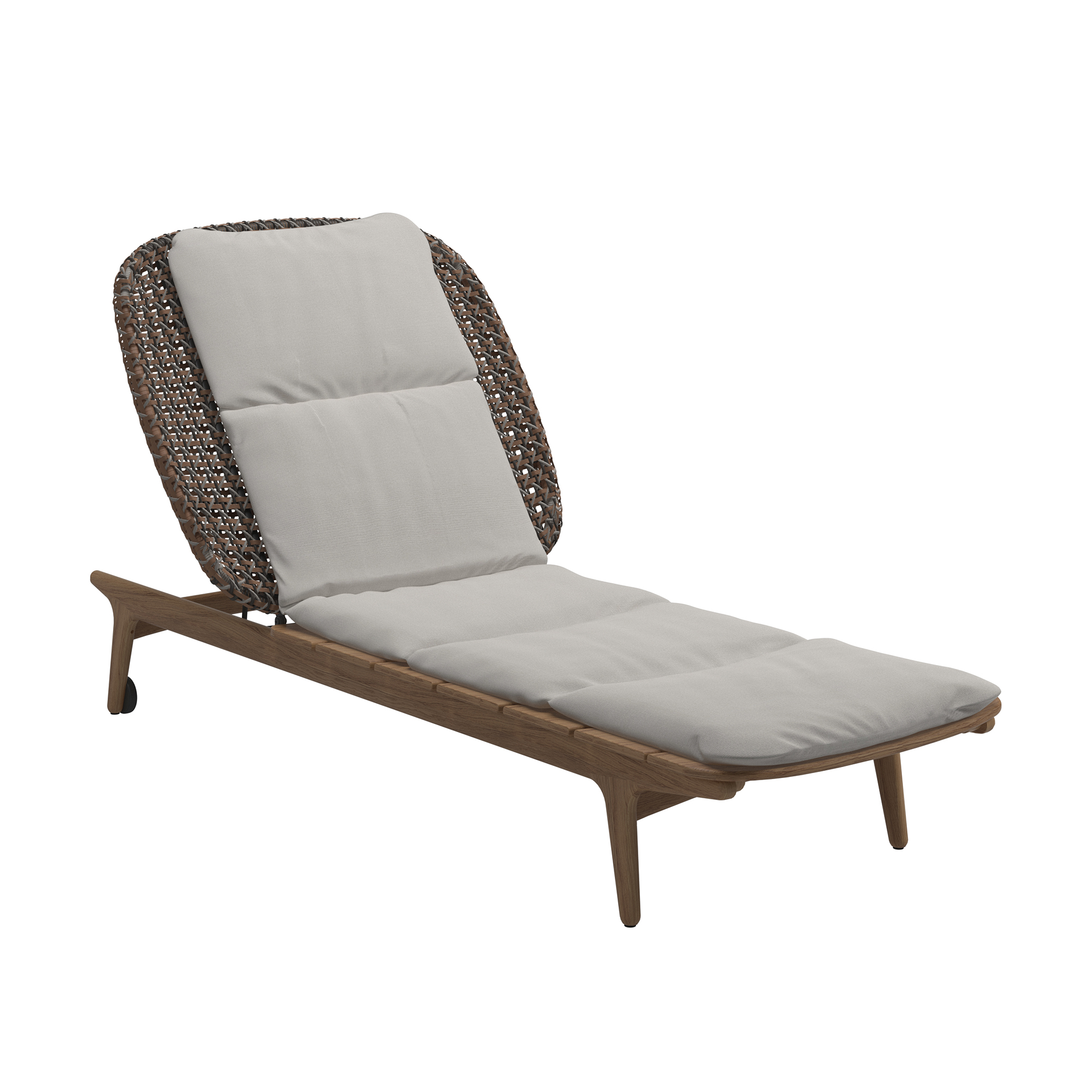 Designern Henrik Pedersen står bakom skapelsen av solsängen Kay Lounger för det renommerade utomhusmärket Gloster. Denna lyxiga solstol utmärker sig med sina estetiska detaljer och är idealisk för en rad olika utomhusmiljöer. Med sitt stilrena teakunderrede, utrustat med två praktiska hjul, är Kay Lounger enkel att förflytta. Ryggstödet är utformat med en flätad struktur och finns tillgängligt i tre olika kulörval. Ryggstödets lutning kan justeras för att erbjuda maximal komfort. En behaglig dyna, tillverkad i ett hållbart tyg anpassat för utomhusbruk, kompletterar solsängens design och finns att välja bland flera naturnära färgtoner. Alla våra tyger är designade för att stöta bort vatten och torka snabbt. Om du är intresserad av ett tyg som inte finns listat på vår webbplats, tveka inte att kontakta vår kundservice. Observera att våra tyger inte är helt vattentäta, så vi rekommenderar att de förvaras under tak när det regnar. Kay Lounger är en del av Kay-kollektionen, som innehåller flera olika typer av sittmöbler avsedda för utomhusanvändning.