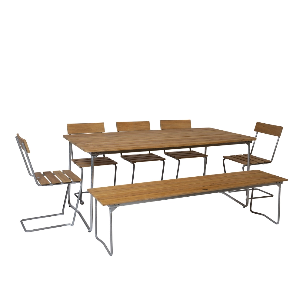 Grythyttan Stålmöbler - Klassikerserien Matgrupp Bord B31, Bänk 9 & 5 st Stol 1 Teak - Matgrupper utomhus