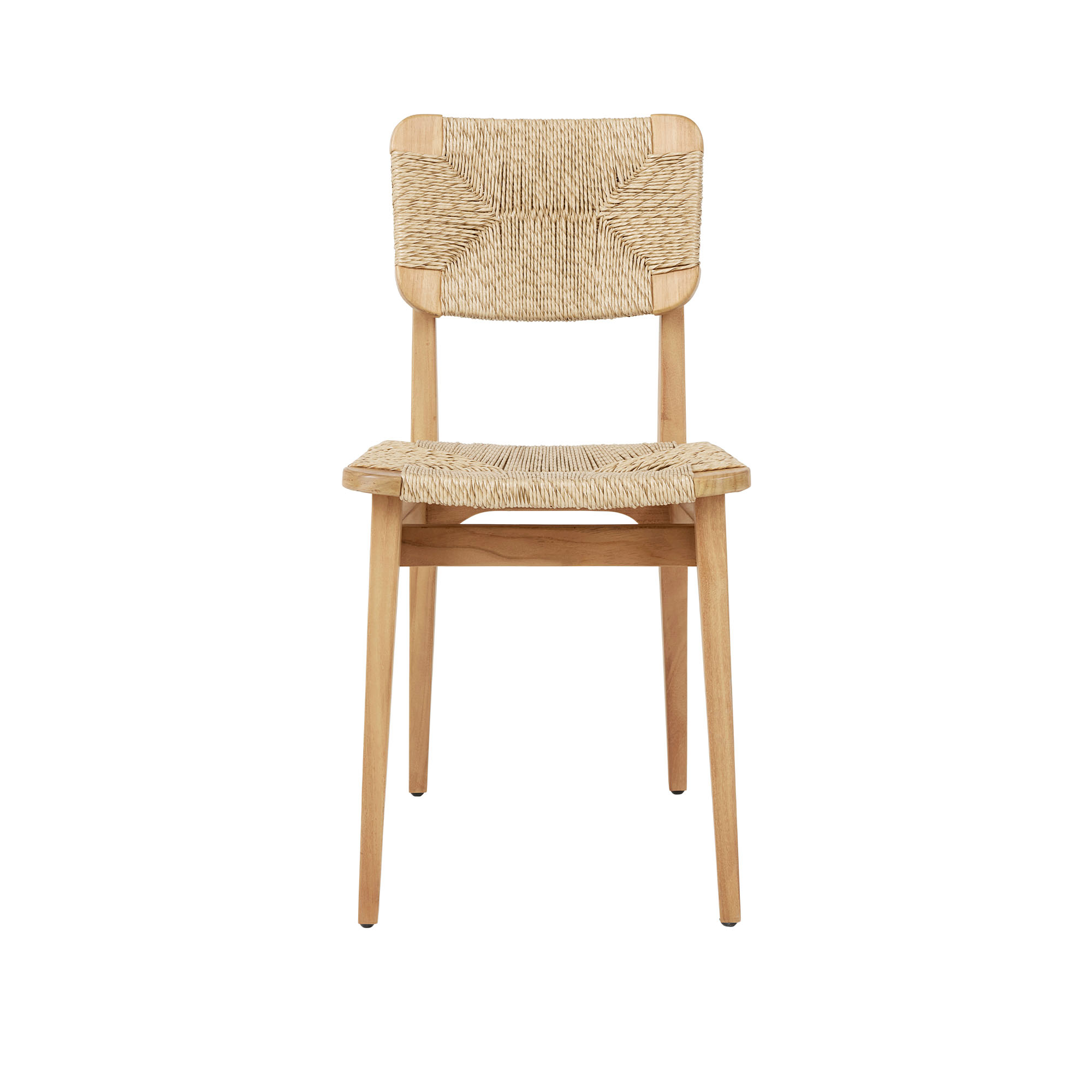 C-Chair Dining Chair Outdoor från Gubi har en ram i naturlig teak och är optimerad för både komfort och väderbeständighet. Ryggstöd och sits är vävda av en robust utomhusfiber som tål alla väderförhållanden och efterliknar naturligt hyacintvävda material. Med sin eleganta design och ergonomiska anpassning passar C-Chair utmärkt i trädgårdar, på terrasser och andra utomhusutrymmen.