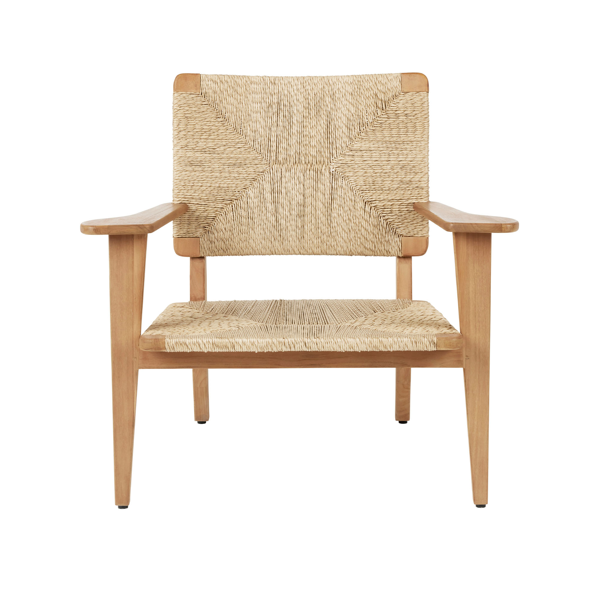 F-Chair Lounge Chair Outdoor från Gubi är en avslappnad loungestol med en bas i naturlig teak. Stolen är utvecklad från den ikoniska C-Chair och har avsmalnande bakben och upprättstående framben. Dess lutande rygg och breda, vävda sits tillsammans med paddelformade armstöd ger optimal komfort och gör F-Chair till ett perfekt val för utomhusmiljöer som trädgårdar och terrasser.