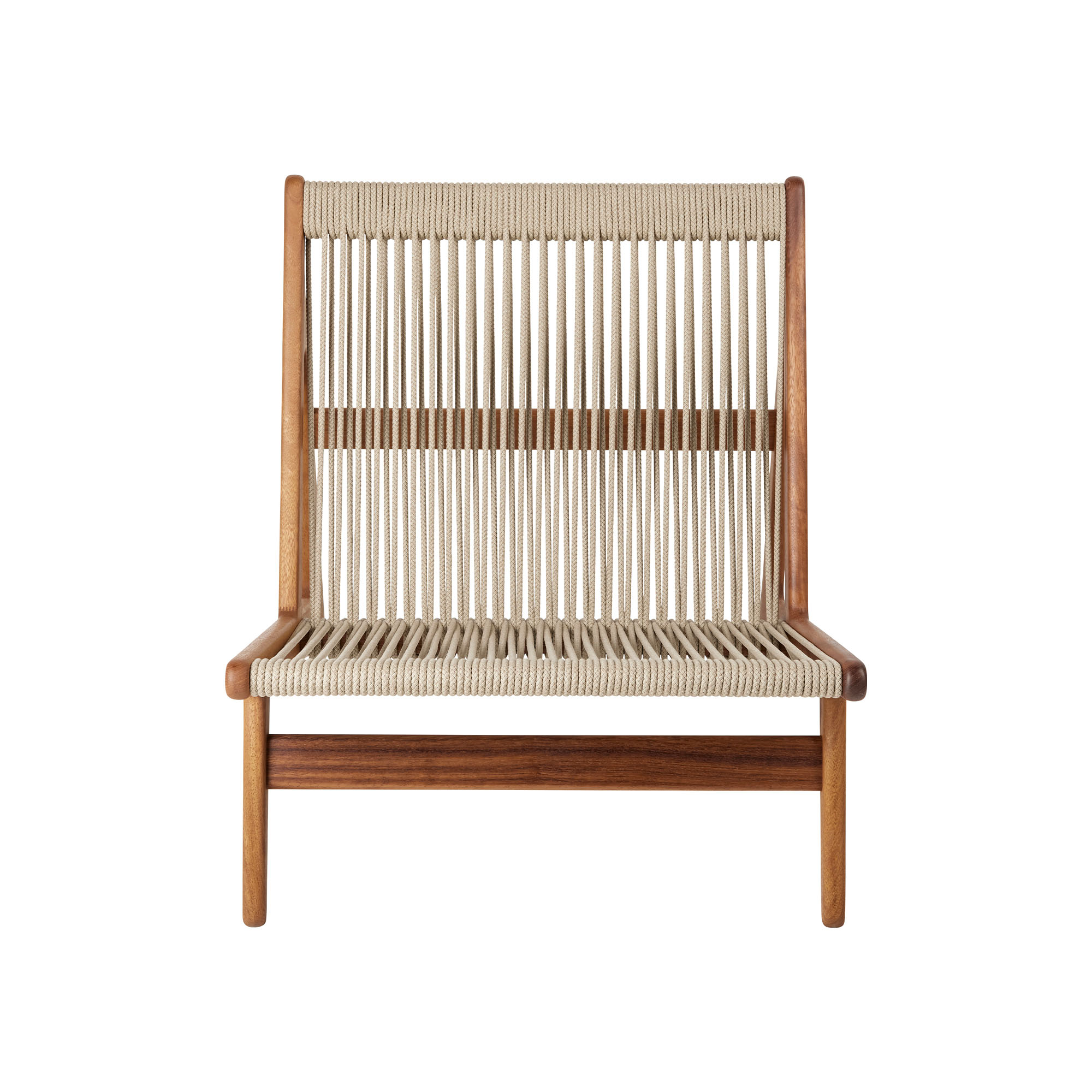MR01 Initial Lounge Chair Outdoor från Gubi, designad av Mathias Steen Rasmussen, är tillverkad av FSC®-certifierad iroko och utrustad med ett sits- och ryggstöd i högpresterande polyesterrep. Repet är både vattentätt och UV-resistent, vilket gör stolen perfekt för utomhusmiljöer som vid poolkanten. Den skruvfria träramen framhäver stolens skulpturala kvalitet och erbjuder en hållbar lösning för utomhusbruk, utan att kompromissa med den ikoniska designens estetik och funktion.