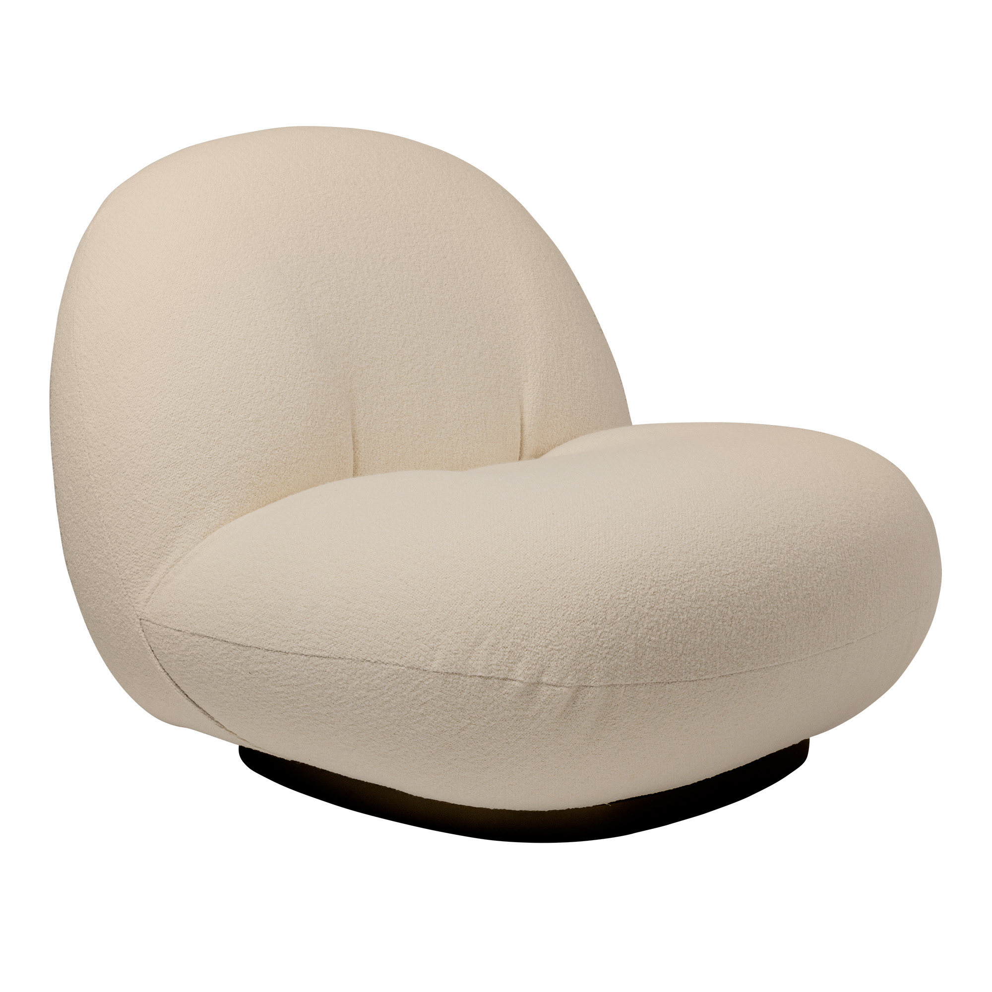 Pacha Lounge Chair, en skapelse av Pierre Paulin från 1975, har återintroducerats av Gubi under 2018. Denna välkomnande fåtölj kännetecknas av sin rymliga och rundade form samt dess sofistikerade proportioner som levererar en överlägsen sittkomfort. Designen av Pacha Lounge Chair är ett exempel på Paulins vision om en lägre sittställning, där en närmare kontakt med golvet uppnås genom en låg bas istället för traditionella ben. Fåtöljen erbjuds i en mångfald av textilier med varierande material och kulörer. Dess bas kan erhållas i antingen Pearl Gold eller Soft Black. Bilden av produkten visar Dedar Karokorum 001 Ivory.
