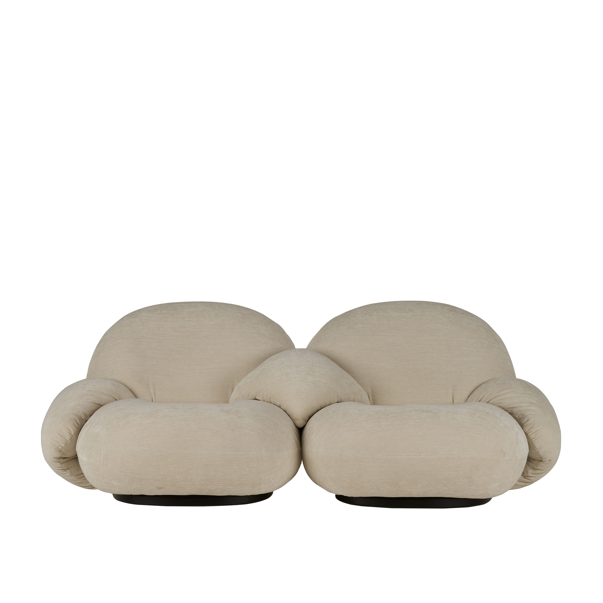 Tvåsitsiga Pacha-soffan med mittplacerade armstöd är en skapelse av det danska märket Gubi, designad av Pierre Paulin 1975. Denna soffa är uppbyggd av ett skummaterial och har en intern ram av böjlig plywood. Dess bas är konstruerad av MDF och finns med en finish i antingen Pearl Gold eller Soft Black. Den kännetecknande designen av Pacha-soffan är dess inbjudande och mjuka form. Armstöden, som finns både vid sidorna och i mitten, erbjuder omfattande stöd och möjligheten att luta sig bekvämt åt alla håll.