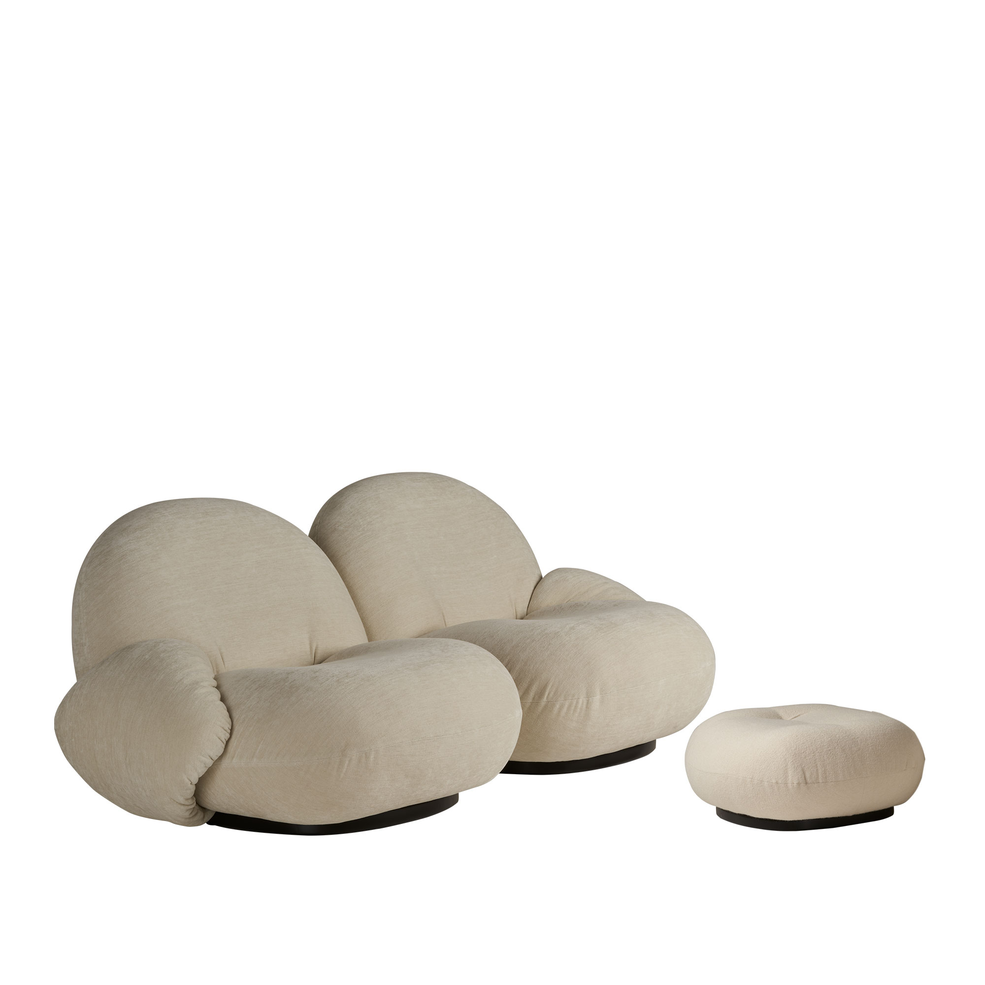 Pacha-soffan med två säten och en ottoman, som inkluderar armstöd, är ett verk av Pierre Paulin från 1975 och tillverkas av det danska företaget Gubi. Denna soffa är konstruerad med en kärna av böjlig plywood och är stoppad med skum. Dess bas är gjord av MDF som är målad och finns i färgalternativen Soft Black eller Pearl Gold. Det som utmärker Pacha-soffan är dess rundade, inbjudande form som erbjuder en hög nivå av komfort. Pierre Paulin hade som mål att förmedla en upplevelse liknande den av att ""flyta på moln"" när han skapade Pacha. Möbeln utstrålar en avkopplande och naturlig estetik, men Paulin har också alltid prioriterat ergonomi, något som blir uppenbart när man sätter sig i en av hans möbler. Pacha-serien har utvecklats till en kollektion av bekväma lounge-möbler som kan kombineras för att skapa en större modulär soffa. Det finns även möjlighet att beställa en fyrsitsig version eller välja annat tyg eller läder. För mer information eller för att göra en beställning, tveka inte att kontakta oss.