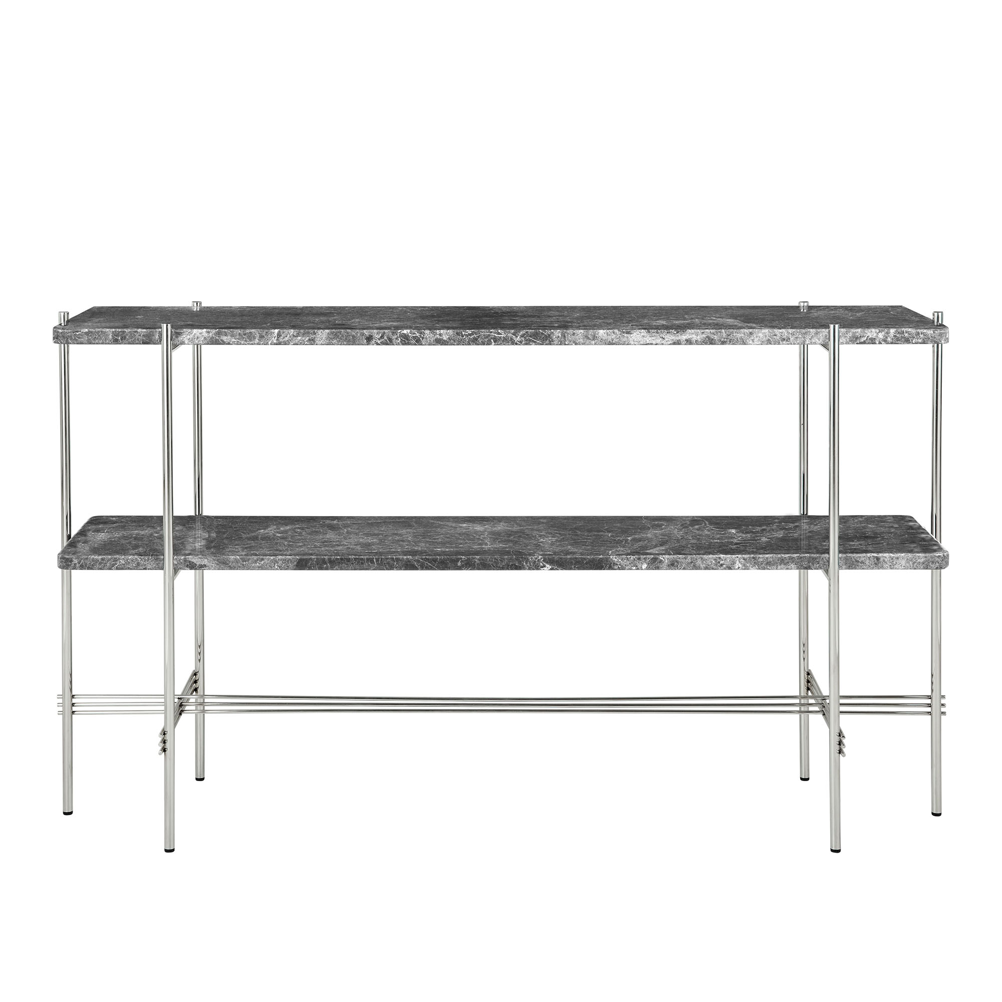 Gubi - TS Console, 120x30x72, 2 racks Polished Steel Base, Table Top Grey Emperador Marble - Avlastningsbord - GamFratesi - Grå - Metall/Sten