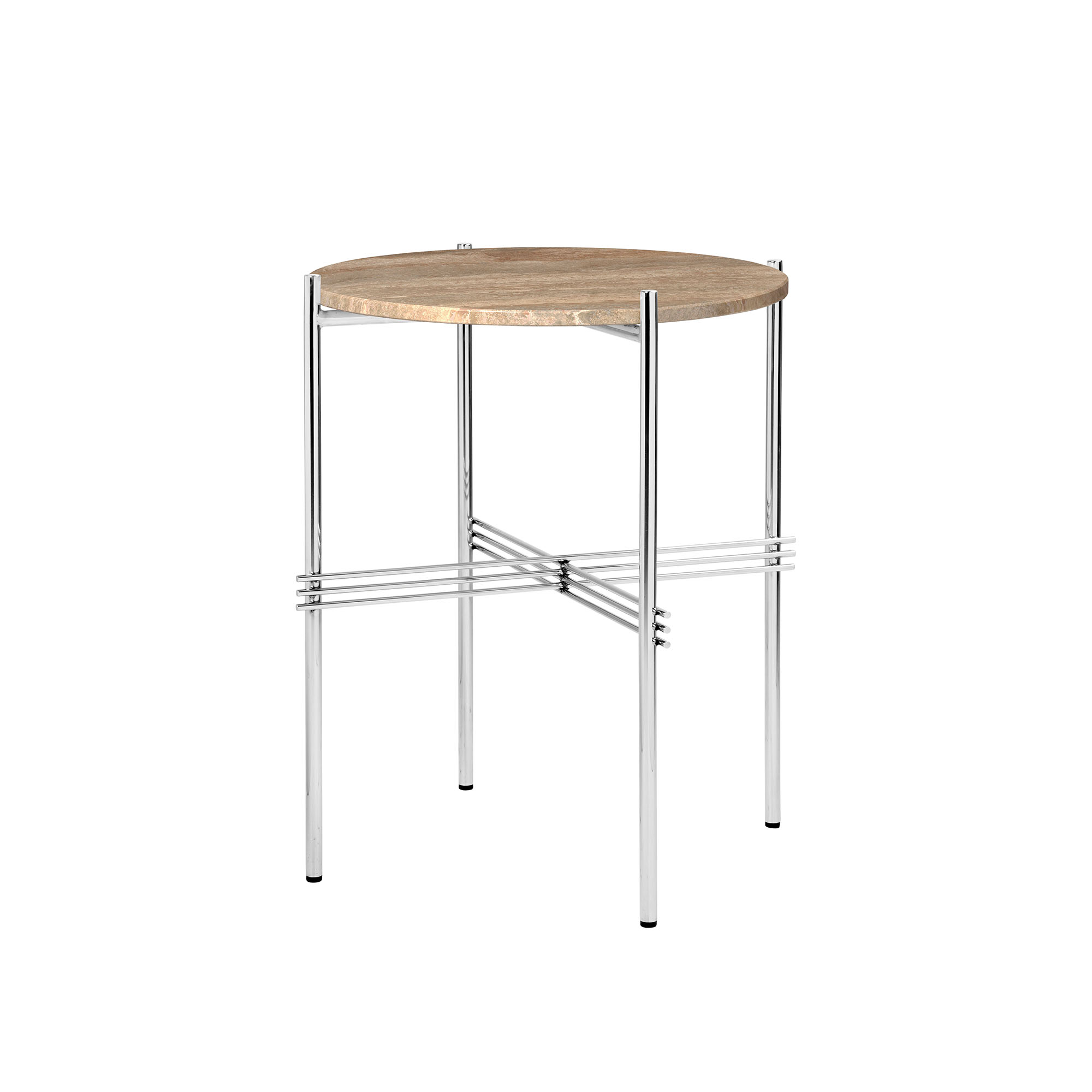 Gubi - TS Side Table - Round, Ø40 Polished Steel Base, Table Top Warm Taupe Travertine - Småbord och sidobord utomhus - GamFratesi - Beige - Metall/Sten
