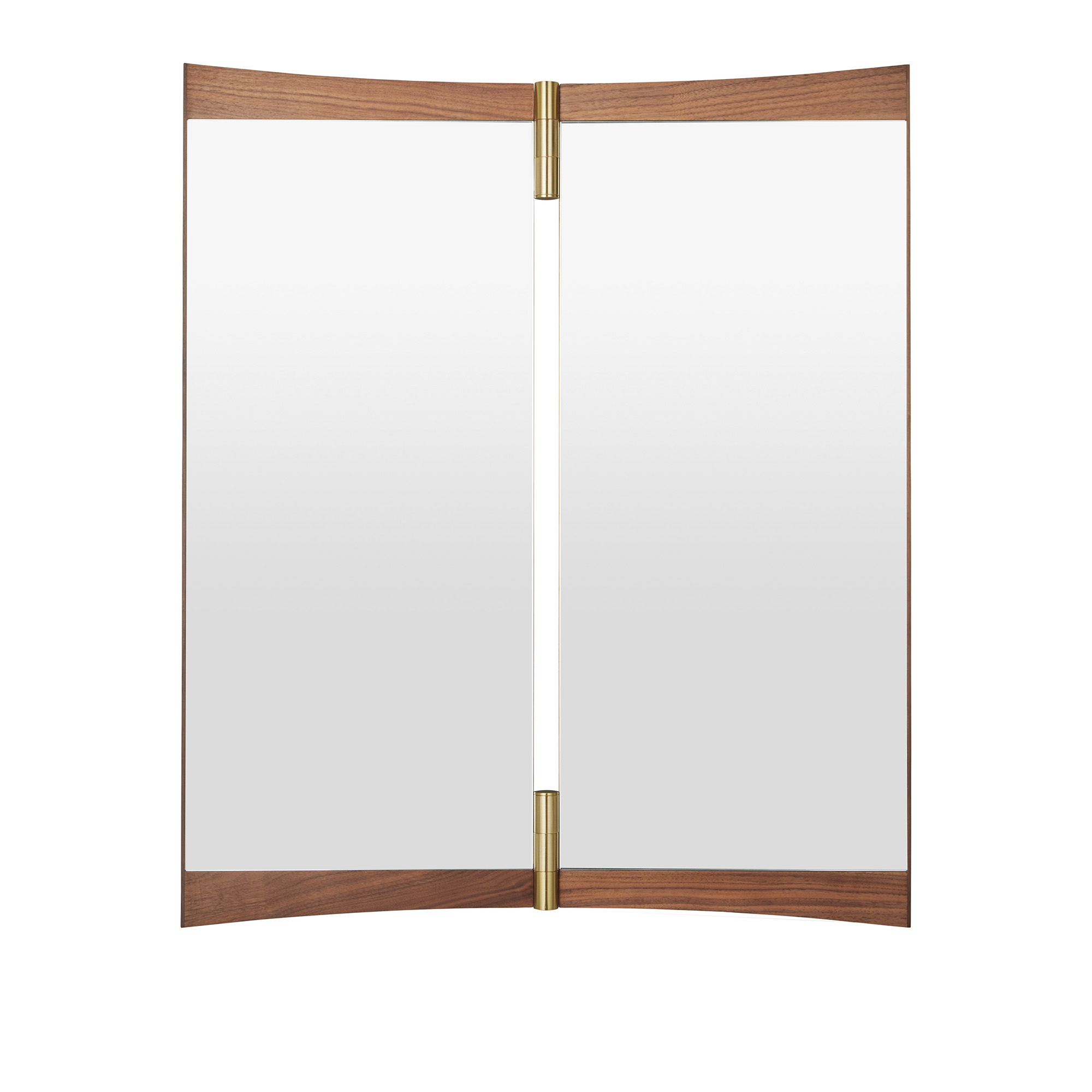 Vanity Mirror Collection är en modern tolkning av de tidlösa sminkbordsspeglarna från 1700-talet, skapade av det hyllade designduon GamFratesi. Denna kollektion bjuder på en sublim förening av estetik och funktion som tar dig tillbaka till en era av tidlös elegans. Mässingsgångjärnen som sammanfogar spegelpanelerna är en mästarklass i hantverk och precision. Varma valnötsfanerer kompletterar de skräddarsydda gångjärnen och ger en kontrast som är både sofistikerad och vacker. GamFratesi har visat sin förmåga att förena det klassiska med det moderna i samarbetet med GUBI och Vanity Mirror Collection är inget undantag.