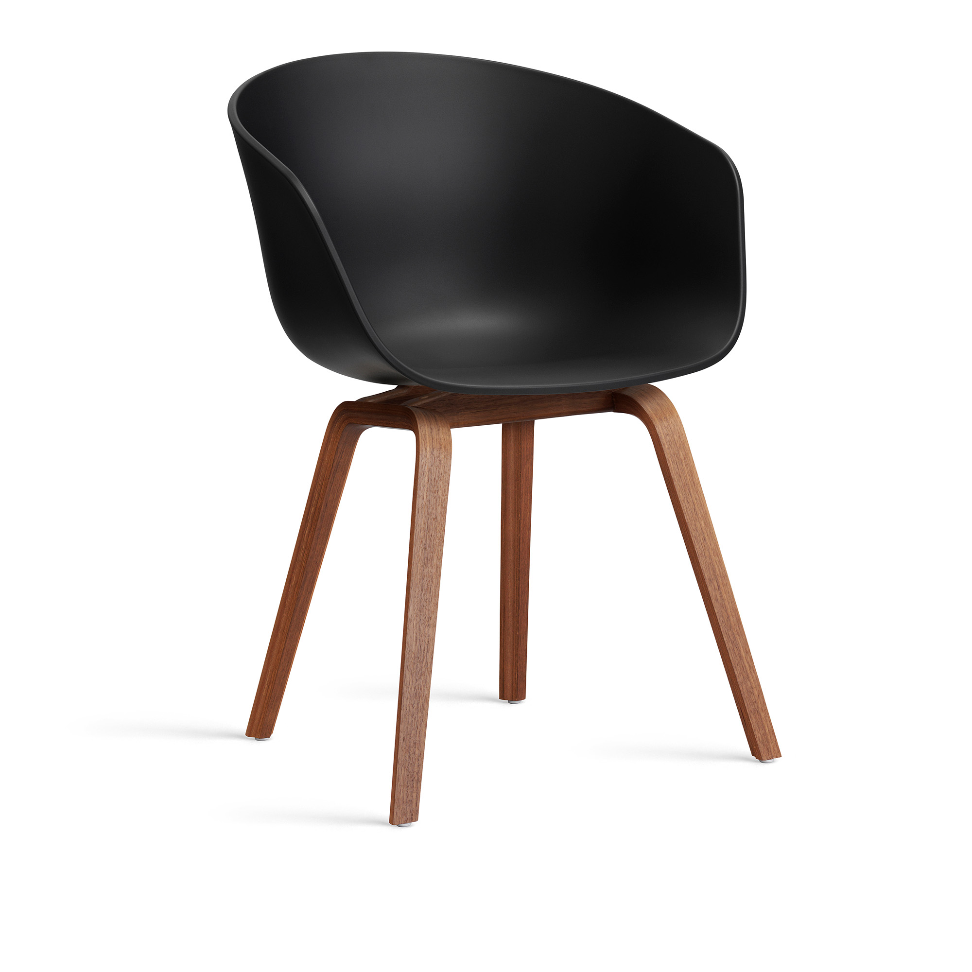 AAC 22 från Hay, designad av Hee Welling, förenar komfort och elegans. Stolens böjda rygg och armstöd ger en mjuk och inbjudande form, medan basen i lackerad valnöt tillför värme och stabilitet. Denna kombination av ett solitt skal och valnötens djupa toner skapar en mångsidig stol som passar i många typer av interiörer, från eleganta matsalar till moderna kontor.