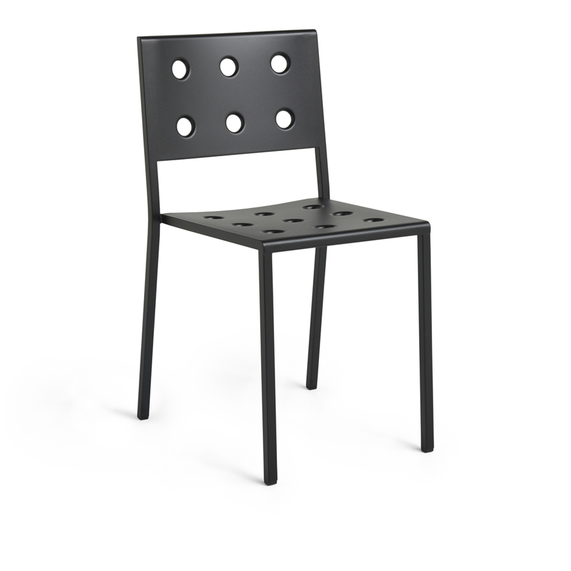 Balcony Dining Chair är en praktisk matstol att använda utomhus från det danska varumärket HAY, formgiven av de franska bröderna Ronan och Erwan Bouroullec. Skapad med fyrkantiga hårda former som bryts av med mjuka cirkulära hål, vilket ger stolen ett intressant intryck. De raka linjerna som ramar in och följer ut i benen ger stolen en minimalistisk ton. Stolen är i pulverlackerat stål och har en primer över sig som gör den tålig. Balcony Dining Chairs tidlösa design och det tåliga utförandet gör att den inreder och fyller en funktion på din uteplats i många år. Enkel att förvara med sin stapelbara design. Stolen finns även i samma modell men med stödjande armstöd – Balcony Dining Armchair.
