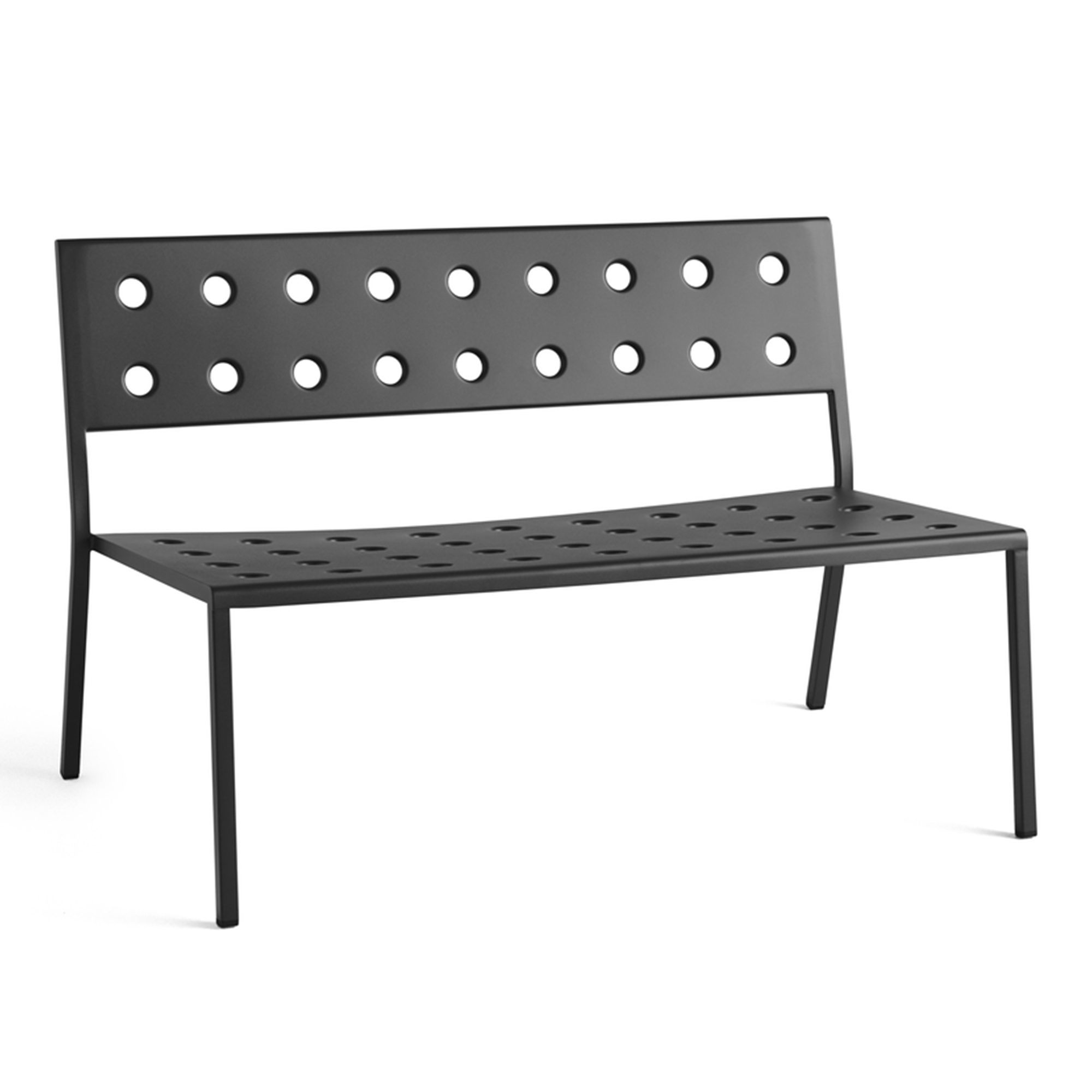 Balcony Lounge Bench är en stilren utomhusbänk från danska varumärket HAY, formgiven av Ronan och Erwan Bouroullec. Bänken har ett geometriskt formspråk som består av rektangulära former och runda hål. Bänken har ett lekfullt men samtidigt minimalistiskt utseende som gör den tidlös. Balcony Lounge Bench är gjord i pulverlackerat stål med en primer som gör den vädertålig. Denna mångsidiga bänk kan användas i många typer av utomhusmiljöer, som till exempel på terrasser eller på balkonger.