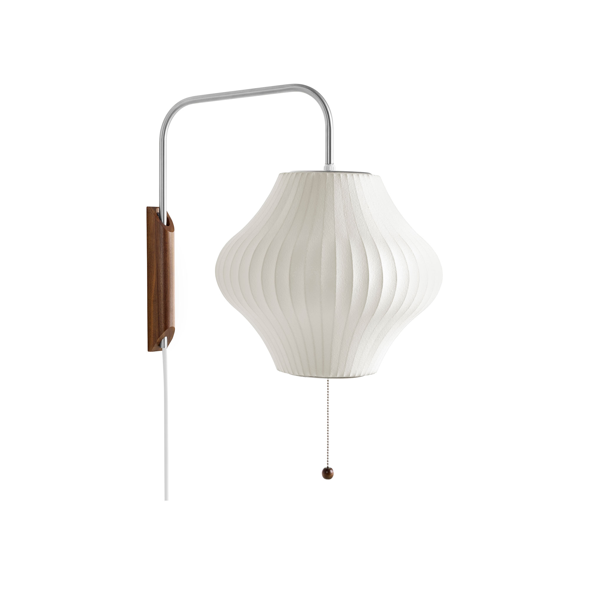 Nelson Pear Wall Sconce är en vägglampa från danska Hay, formgiven av George Nelson. Den legendariska amerikanska formgivaren George Nelson presenterade den ikoniska lampserien Nelson 1947 då han fann inspiration från en svensk silkesklädd taklampa. Vägglampan kom först i produktion 1952 och serien expanderades genom åren med flera olika modeller i olika mönster och former. Lampan har en stomme i borstad nickel och en skir lampskärm i webbad polymer. Finns i flera olika utföranden.