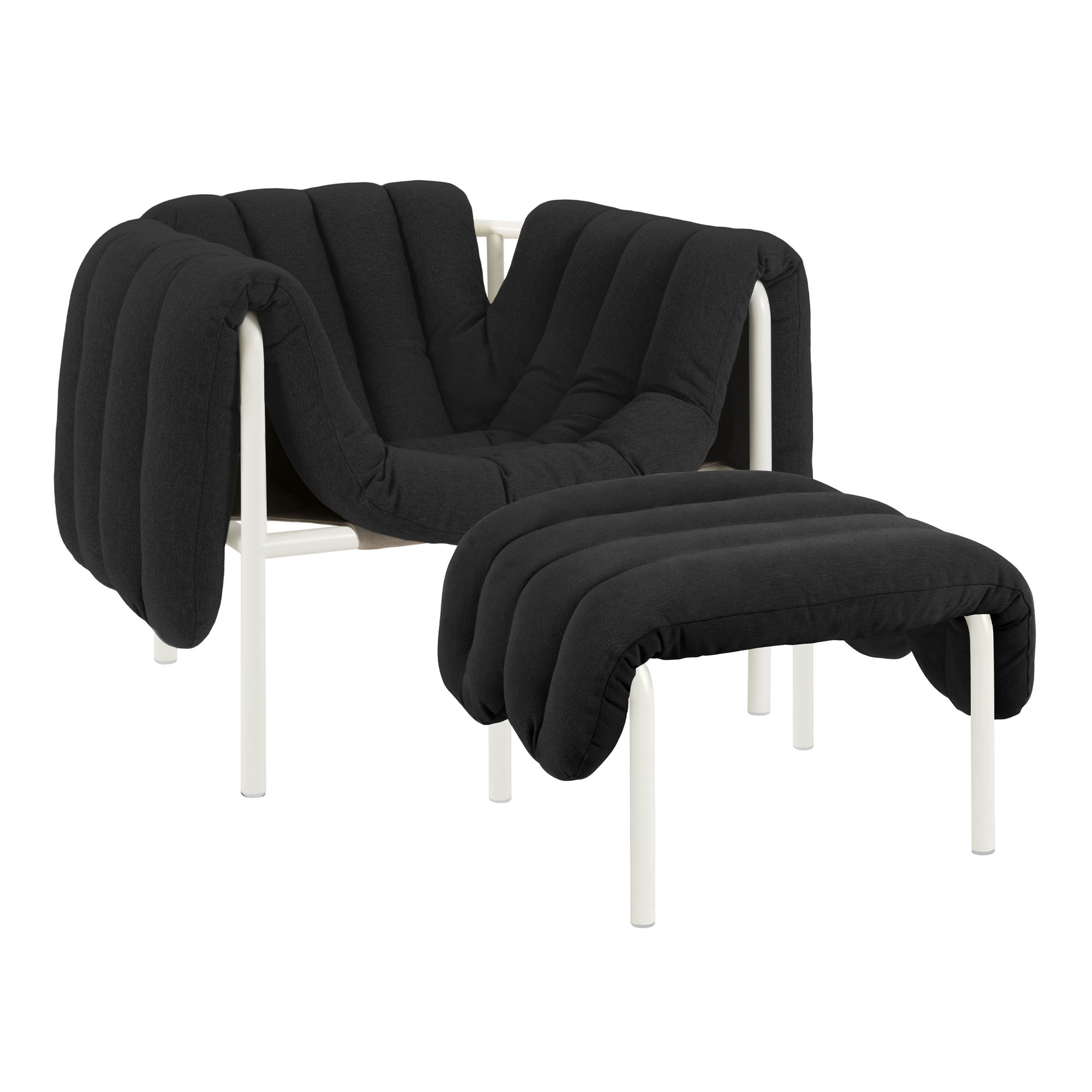 Puffy Lounge Chair + Ottoman är formgiven av Faye Toogood för varumärket Hem och kännetecknas av sin avtagbara och mjuka klädsel som rikligt draperar över sidorna på en stålram. Denna ram bildar en kontrast med sina strama linjer och robusta konstruktion. Ramen för Puffy erbjuds i antingen pulverlackerade eller sandblästrade stålytor, med klädsel som inkluderar tjock canvas, bouclé, eller läder.