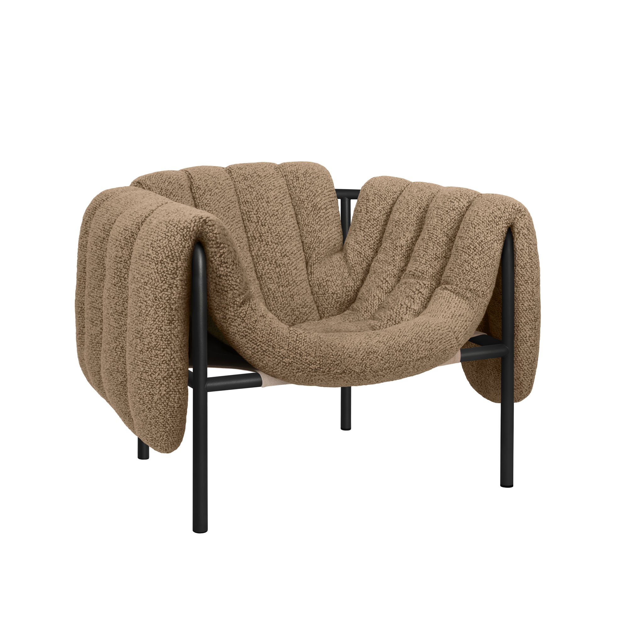Puffy Lounge Chair är formgiven av Faye Toogood för varumärket Hem och kännetecknas av sin avtagbara och mjuka klädsel som rikligt draperar över sidorna på en stålram. Denna ram bildar en kontrast med sina strama linjer och robusta konstruktion. Ramen för Puffy erbjuds i antingen pulverlackerade eller sandblästrade stålytor, med klädsel som inkluderar tjock canvas, bouclé, eller läder.