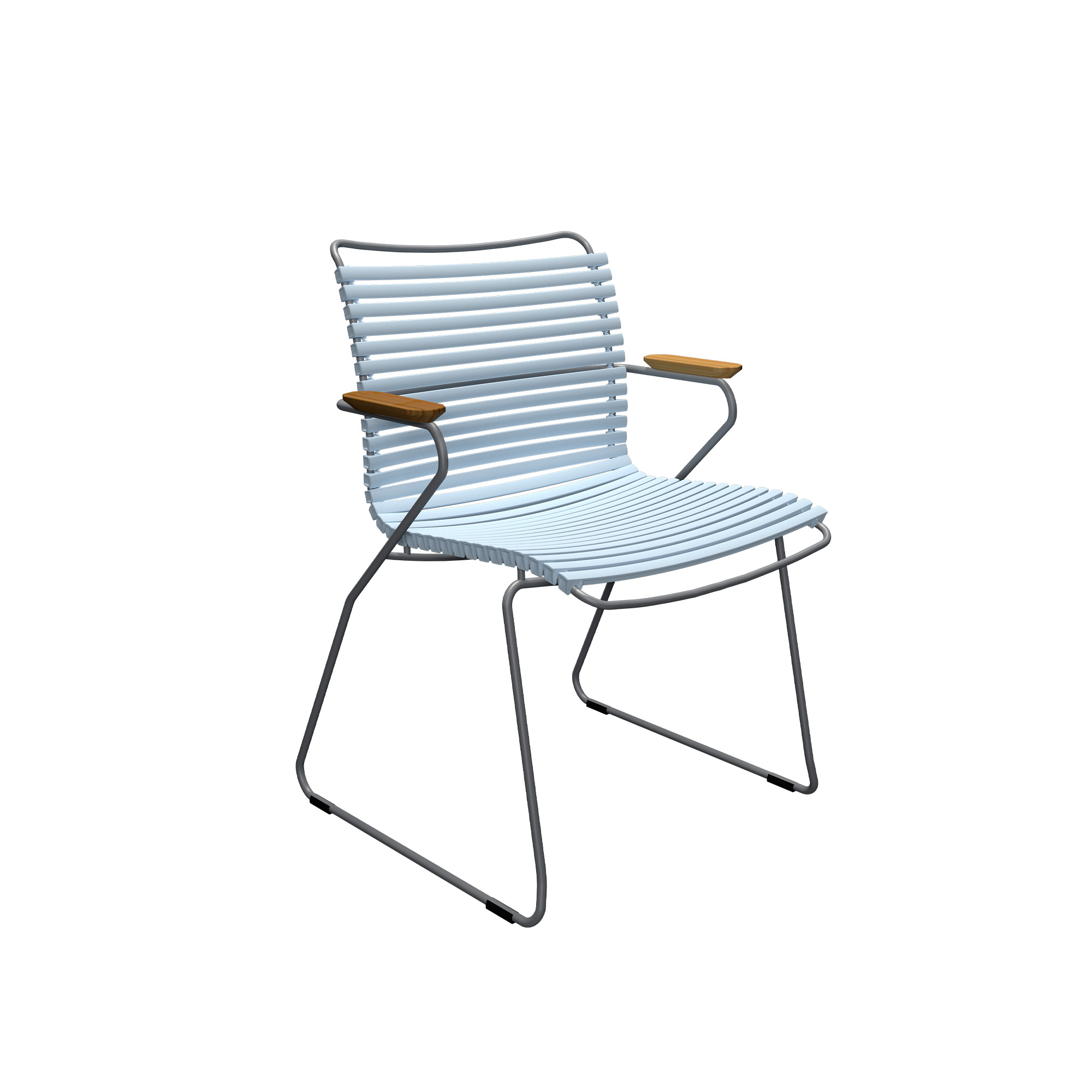 CLICK Dining Chair är en stapelbar matstol för utomhusbruk med bambuarmstöd, ram i pulverlackerat stål och sits av plastlameller. Den är designad av danska Henrik Pedersen för HOUE och framhäver enkelhet, ärlighet och genomtänkt ergonomi. Dess design skapar en visuell harmoni runt bordet, med lameller som ger utmärkt komfort utan behov av kuddar tack vare sin precisa styrka och flexibilitet. Lamellerna kan enkelt klickas av och på, vilket möjliggör för användaren att ändra utseendet genom att byta eller mixa färgerna.