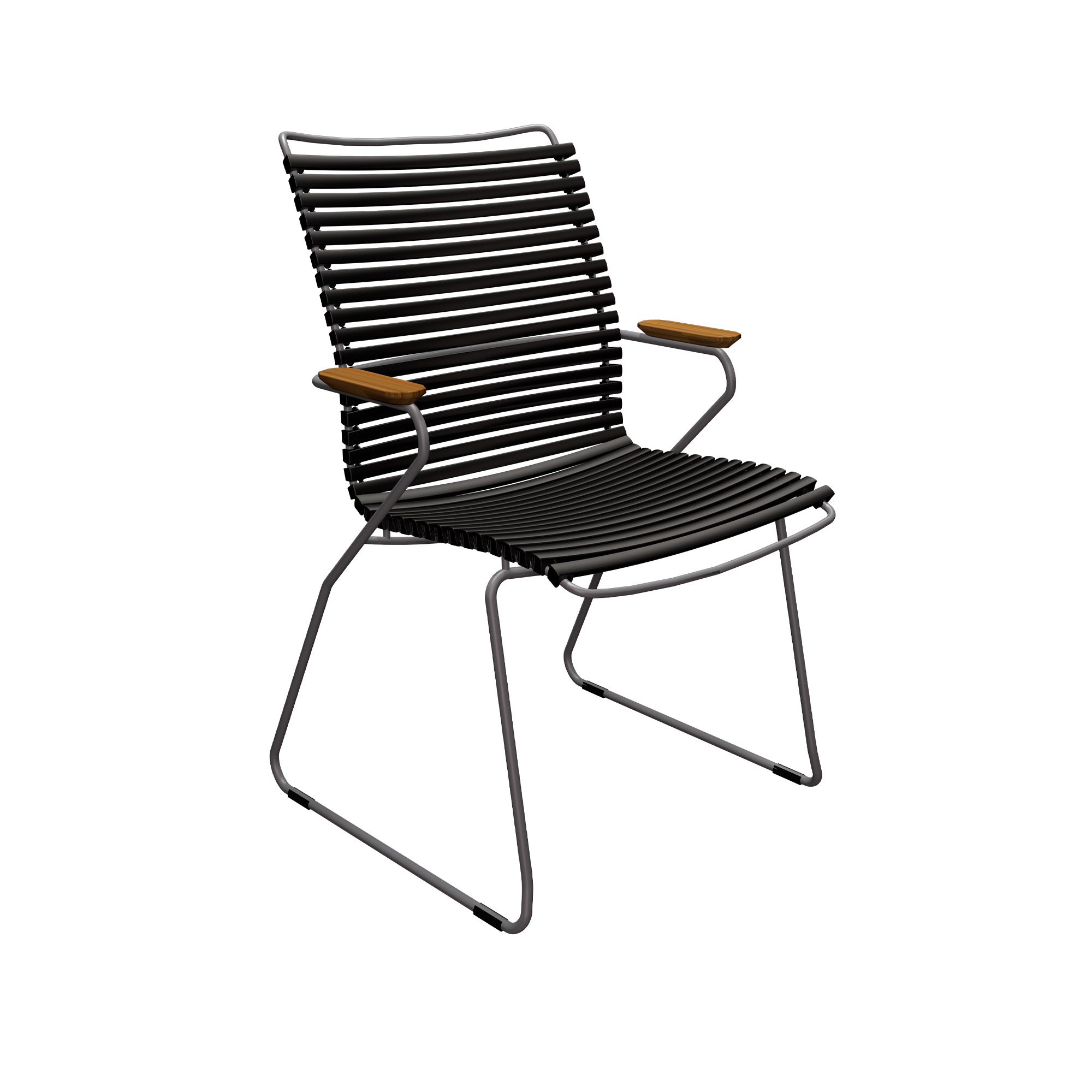 CLICK Dining Chair Tall Back är en stapelbar matstol från det danska varumärket HOUE. Det är en vidareutveckling av deras klassiska Click Dining Chair, utrustad med ett högre ryggstöd för att erbjuda bättre stöd och bekvämlighet. Den är designad av Henrik Pedersen och dess utseende bidrar till en estetisk enhetlighet runt matbordet. Stolen består av en ram av pulverlackerad grå metall, en sits av plastlameller och armstöd av bambu. Tack vare de utbytbara lamellerna kan du enkelt mixa och byta färger efter behov.