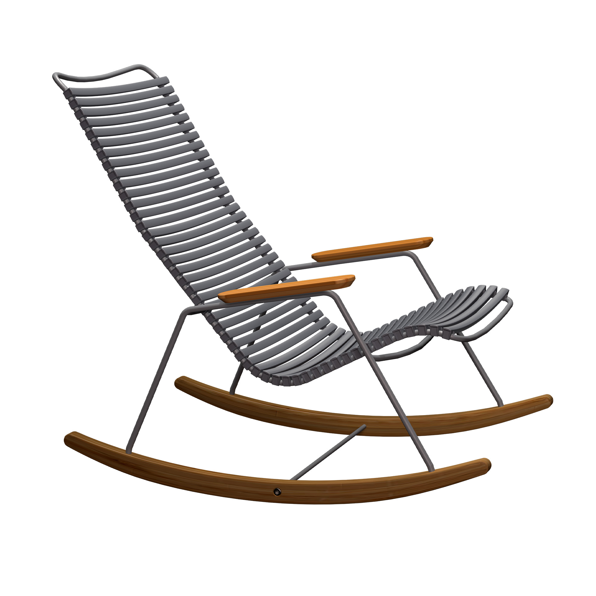 CLICK Rocking Chair, designad av Henrik Pedersen för HOUE, är en gungstol för utomhusbruk som representerar en perfekt balans mellan funktion, stil och komfort. Gungstolen uppskattas av både vuxna och barn för dess förmåga att erbjuda vila genom dynamiska gungande rörelser. Stolen erbjuder dessutom exceptionell komfort tack vare den genomtänkta designen och materialvalen. Med en ram av pulverlackerad grå metall, sits av plastlameller samt armstöd och medar i bambu, kombinerar den hållbarhet med estetik.