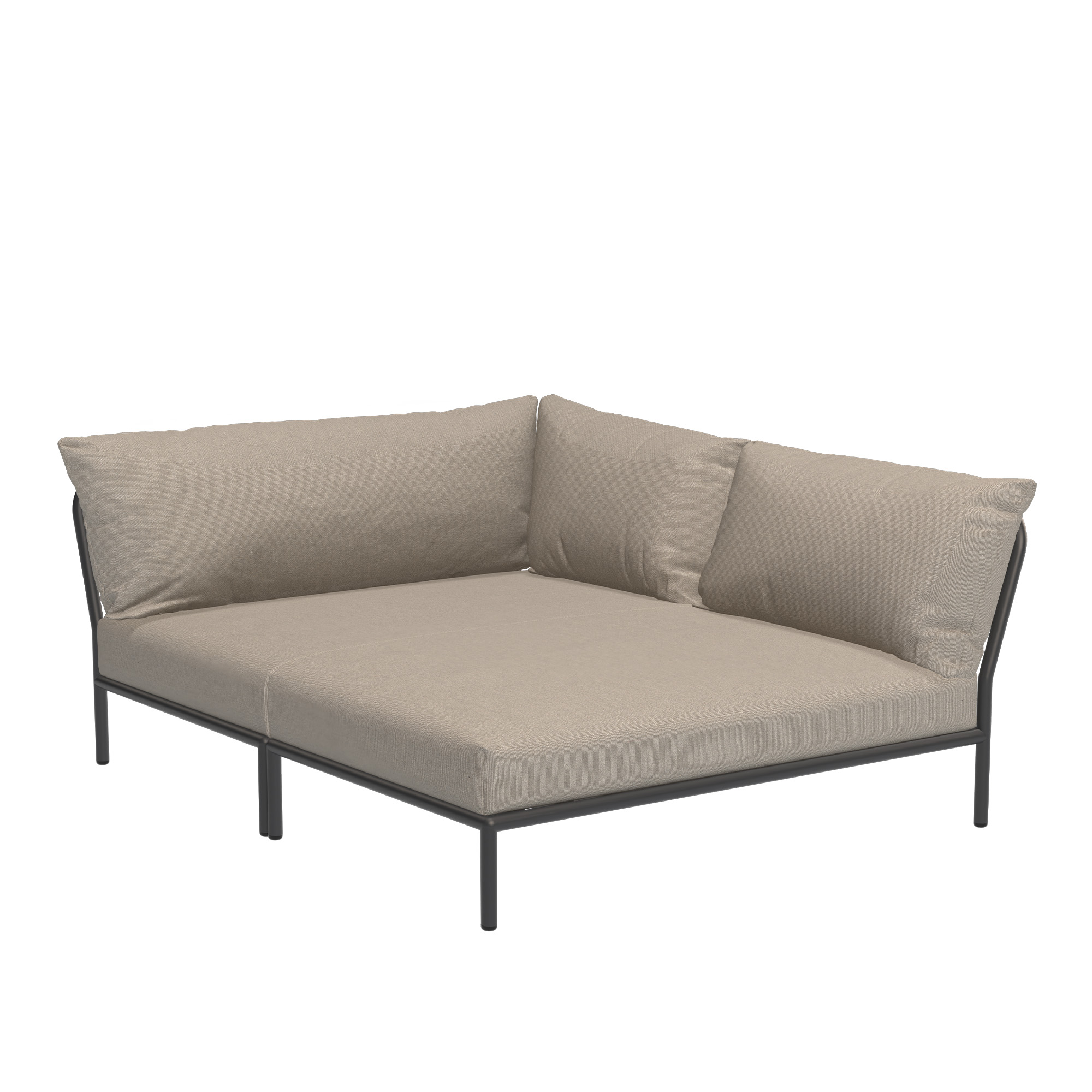 LEVEL 2 Cozy Corner Right är designad av Henrik Pedersen för det danska företaget HOUE. Kollektionen särskiljer sig genom att genom att erbjuda möjligheten att kombinera olika moduler och på så sätt skapa en skräddarsydd och flexibel loungeupplevelse anpassad för varje unik utomhusmiljö. Den lättviktiga ramen i pulverlackerat grått aluminium tillsammans medstora mjuka kuddar skapar en perfekt balans mellan kontrast och komfort, samtidigt som den förmedlar en avslappnad loungeatmosfär. Kuddarnas tyg består av Sunbrella Heritage - ett lättskött material som är resistent mot fläckar och även vattenavvisande.