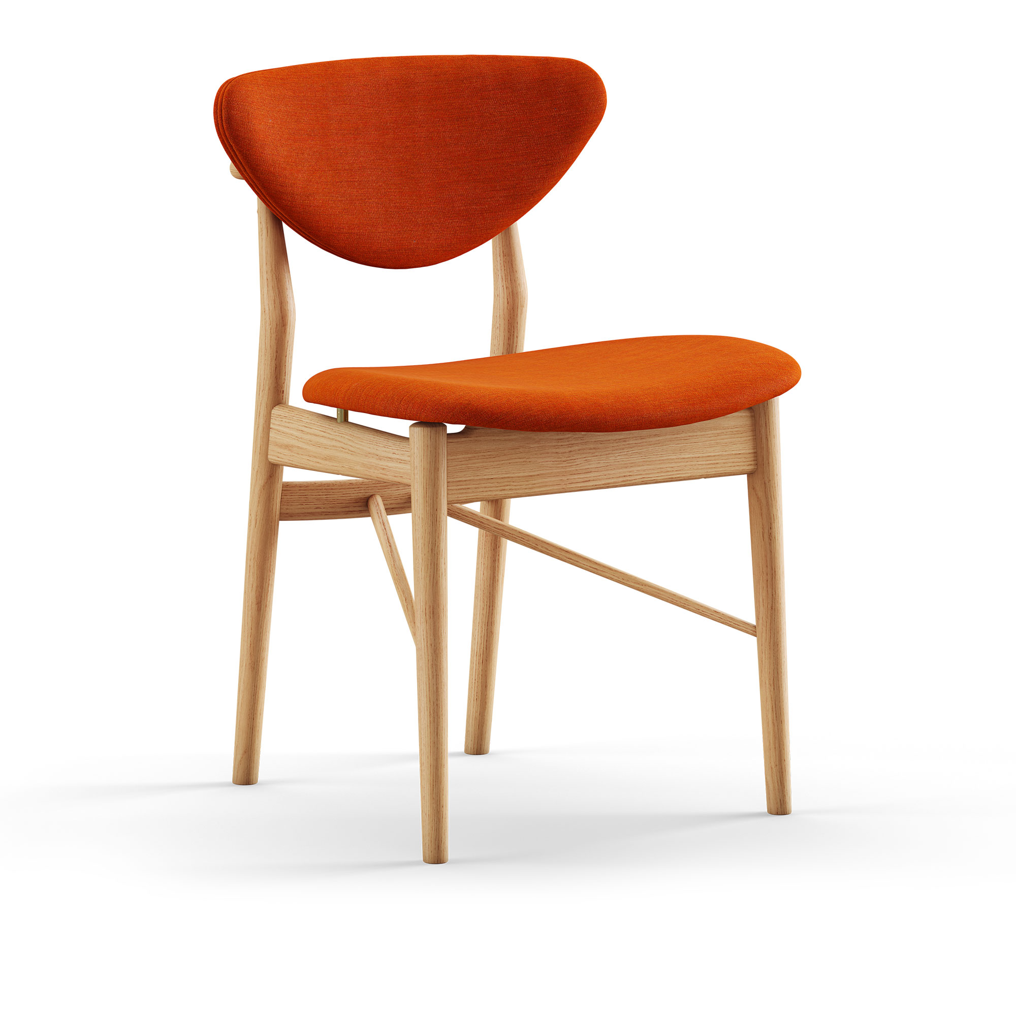 Designikonen 108 Chair, skapad av den berömda formgivaren Finn Juhl under 1946, har återupptagit sin produktion genom House of Finn Juhl sedan 2008. Stolens design reflekterar Juhls designprinciper där de stödjande och de stödda delarna är åtskilda. Detta ger stolen en känsla av elegans och estetisk tilltalande från varje betraktningsvinkel. Med sin stoppade och komfortabla sittplats är den idealisk för användning runt matbordet. Finn Juhls arbete kännetecknas ofta av dess oortodoxa natur och överraskande finesser. Vid första ögonkastet kan 108 Chair verka simpel och likna en standard matstol, men vid en närmare granskning uppenbarar sig en rad sofistikerade detaljer. Exempelvis har stolen särskilt utformade trädelar som är böjda och vinklade, vilka är skickligt sammanfogade, vilket tillför en oväntad känsla av liv och dynamik till dess struktur. Detta bidrar till att ge stolen en distinkt karaktär som är typisk för Juhls design. Stolen är tillgänglig i olika versioner, där du kan välja mellan en ram i antingen ek eller valnöt, och klädseln finns i både textil och läder i flera alternativ. På vår webbplats presenterar vi ett urval av dessa varianter, medan fullständiga alternativ finns listade i vårt produktblad. För ytterligare utföranden eller assistans med din beställning, tveka inte att kontakta oss.
