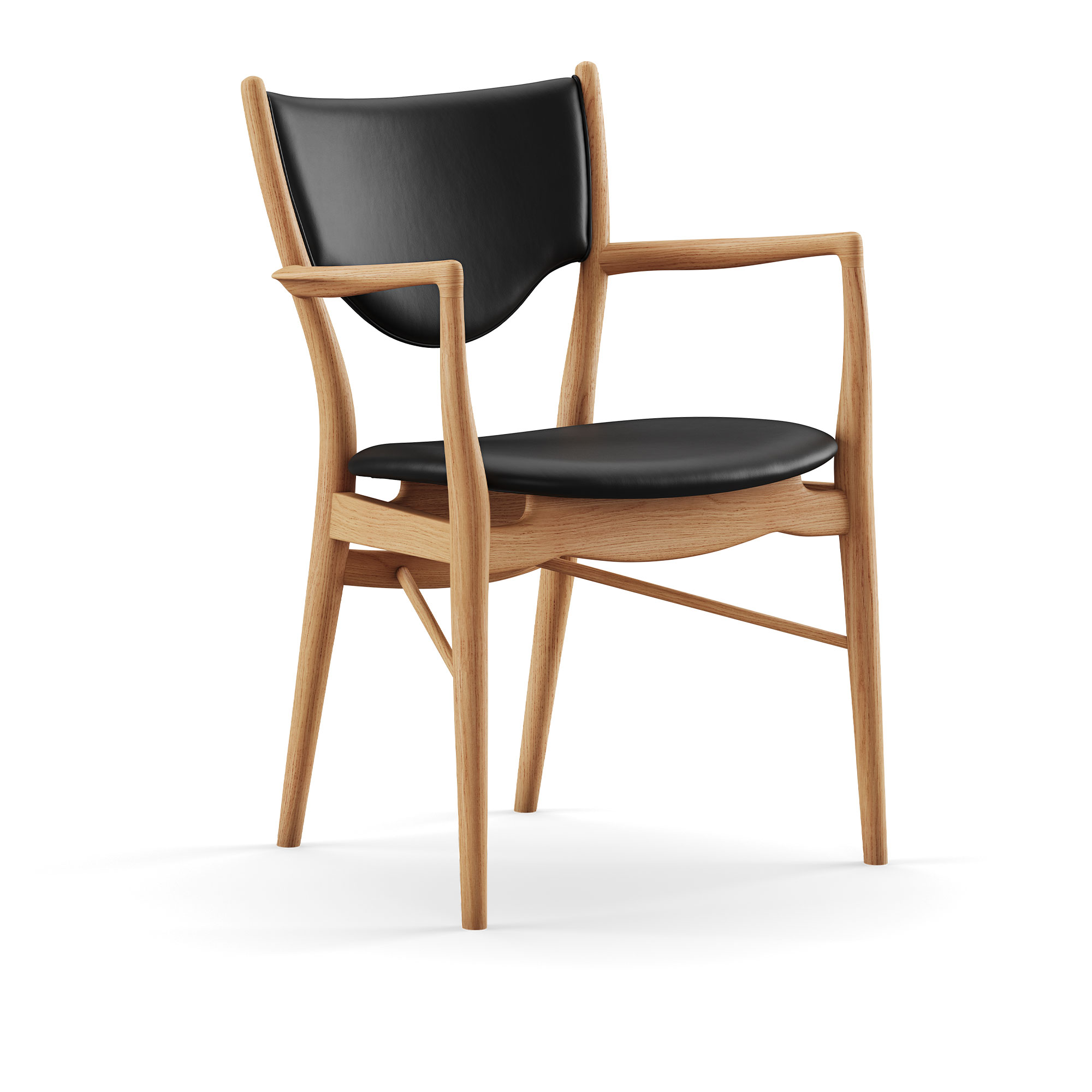 Designern Finn Juhl skapade ursprungligen 46 Armchair för den skicklige snickaren Niels Vodder, som introducerade stolen under Snickarmästarnas Gilleutställning 1946 i Köpenhamn. År 1953 genomförde Finn Juhl förändringar på armstolen, vilket resulterade i en mer strömlinjeformad och förenklad design för möbelföretaget Bovirke. Det är denna reviderade modell av den berömda stolen som nu återintroduceras av House of Finn Juhl. I skapandet av 46 Armchair har Finn Juhl eftersträvat att framhäva stolens elegans genom att skilja de stödjande och de stöttande delarna åt, vilket har kommit att bli ett kännetecken för hans arbete. Med hjälp av dagens avancerade teknologi har House of Finn Juhl, som nu producerar stolen, lyckats förbättra kvaliteten avsevärt med starkare sammanfogningar än de ursprungliga modellerna. Precis som med Chieftain Chair och 45 Chair, representerar 46 Armchair det finaste inom nutida dansk möbeldesign, med sin framstående estetik och exceptionella kvalitet. 46 Armchair tillverkas i antingen ek eller valnöt och kan kläs i olika typer av textilier eller läder. Det finns även en version utan armstöd som erbjuder ett mer avskalat utseende. På vår webbplats presenterar vi ett urval av de olika modellerna, men ytterligare varianter kan du upptäcka i vårt produktblad. Om du önskar en annan variant eller behöver hjälp med din beställning, tveka inte att kontakta oss.