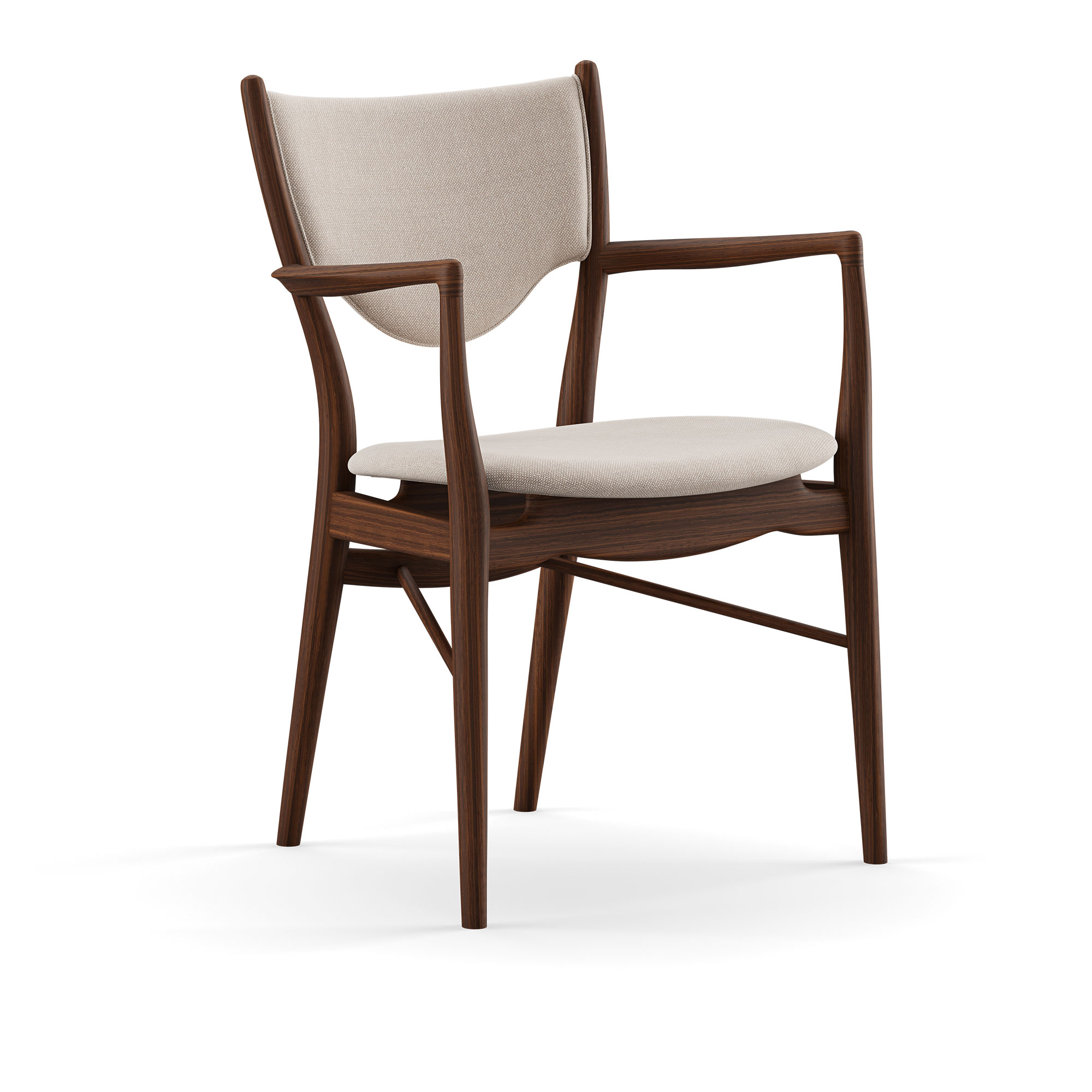 Designern Finn Juhl skapade ursprungligen 46 Armchair för den skicklige snickaren Niels Vodder, som introducerade stolen under Snickarmästarnas Gilleutställning 1946 i Köpenhamn. År 1953 genomförde Finn Juhl förändringar på armstolen, vilket resulterade i en mer strömlinjeformad och förenklad design för möbelföretaget Bovirke. Det är denna reviderade modell av den berömda stolen som nu återintroduceras av House of Finn Juhl. I skapandet av 46 Armchair har Finn Juhl eftersträvat att framhäva stolens elegans genom att skilja de stödjande och de stöttande delarna åt, vilket har kommit att bli ett kännetecken för hans arbete. Med hjälp av dagens avancerade teknologi har House of Finn Juhl, som nu producerar stolen, lyckats förbättra kvaliteten avsevärt med starkare sammanfogningar än de ursprungliga modellerna. Precis som med Chieftain Chair och 45 Chair, representerar 46 Armchair det finaste inom nutida dansk möbeldesign, med sin framstående estetik och exceptionella kvalitet. 46 Armchair tillverkas i antingen ek eller valnöt och kan kläs i olika typer av textilier eller läder. Det finns även en version utan armstöd som erbjuder ett mer avskalat utseende. På vår webbplats presenterar vi ett urval av de olika modellerna, men ytterligare varianter kan du upptäcka i vårt produktblad. Om du önskar en annan variant eller behöver hjälp med din beställning, tveka inte att kontakta oss.