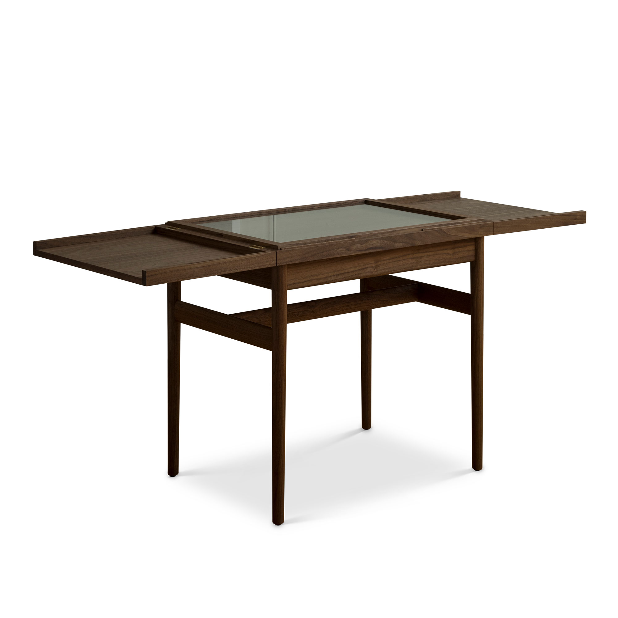 Designen av Art Collector’s Table är ett verk av Finn Juhl, skapat för presentationen han hade tillsammans med den framstående möbeltillverkaren Niels Vodder vid Snickarmästarnas Gilleutställning i Köpenhamn 1948. Detta bord, som är konstruerat av solid amerikansk svart valnötsved, framstår vid första ögonkastet som enkelt och grafiskt, men döljer en unik och sofistikerad funktion. En noggrann granskning avslöjar en mängd fina detaljer. Den uppdelade fanerade bordsskivan kan fällas ut med hjälp av mässingsgångjärn och avtäcker då ett glasöverdraget fack – en idealisk förvaringsplats för samlarens mest skattade objekt. Dessutom erbjuder de utfällda delarna av bordsskivan ytterligare utrymme för avlastning. Tillverkningen av Art Collector’s Table är en komplex process där precision i varje enskild detalj är kritisk för den totala designen. Denna strävan efter perfektion blev tydlig under utställningen 1948, då bordet inte dokumenterades i några fotografier, utan endast genom Finn Juhls skisser och ritningar av utställningsmontern. En möjlig förklaring till detta är att Art Collector’s Table aldrig gick i produktion då, eftersom projektet var för komplicerat och tidskrävande för mästersnickaren Niels Vodder vid den tiden. Nu har dock detta storslagna bord äntligen börjat produceras av House of Finn Juhl, som återintroducerade det år 2018.