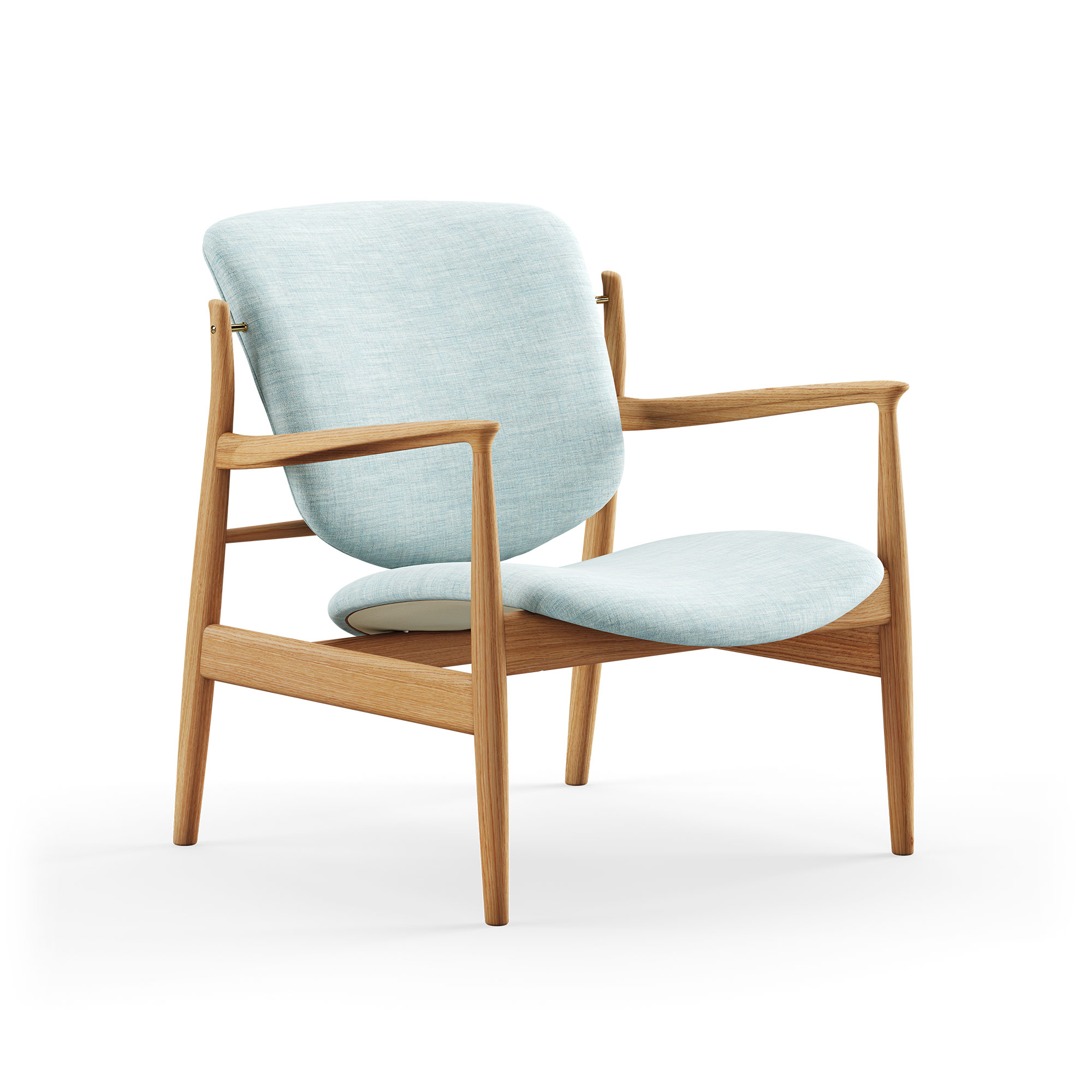 France Chair, även känd under beteckningen FJ 136, är en skapelse från 1956 av designern Finn Juhl. Denna stol är ett tydligt exempel på Juhls distinkta designstil, med en sittdel och ryggstöd som elegant verkar sväva fritt över stolens stomme, samt de anatomiskt anpassade armstöden som också kännetecknar den berömda 45 Chair. Sedan 2016 produceras stolen av House of Finn Juhl och finns tillgänglig i träslagen ek och valnöt. Kunderna kan välja mellan olika typer av handgjorda klädslar i antingen textil eller läder för alla modeller. Ursprungligen skapades France Chair i ett samarbete med möbelföretaget France & Son, specifikt för den amerikanska konsumentmarknaden. Stolen levererades i början som ett platt paket som kunden fick sätta ihop själv, vilket var en central del av France & Sons försäljningskoncept. Detta bidrog till att Finn Juhl och France & Son nådde stora framgångar i USA. Numera skickas stolen dock ut fullständigt ihopsatt. På vår webbplats presenterar vi ett urval av tillgängliga varianter, medan fullständig information om alla modeller finns i vårt produktblad. Om du är intresserad av andra varianter eller behöver assistans med din beställning, tveka inte att kontakta oss.