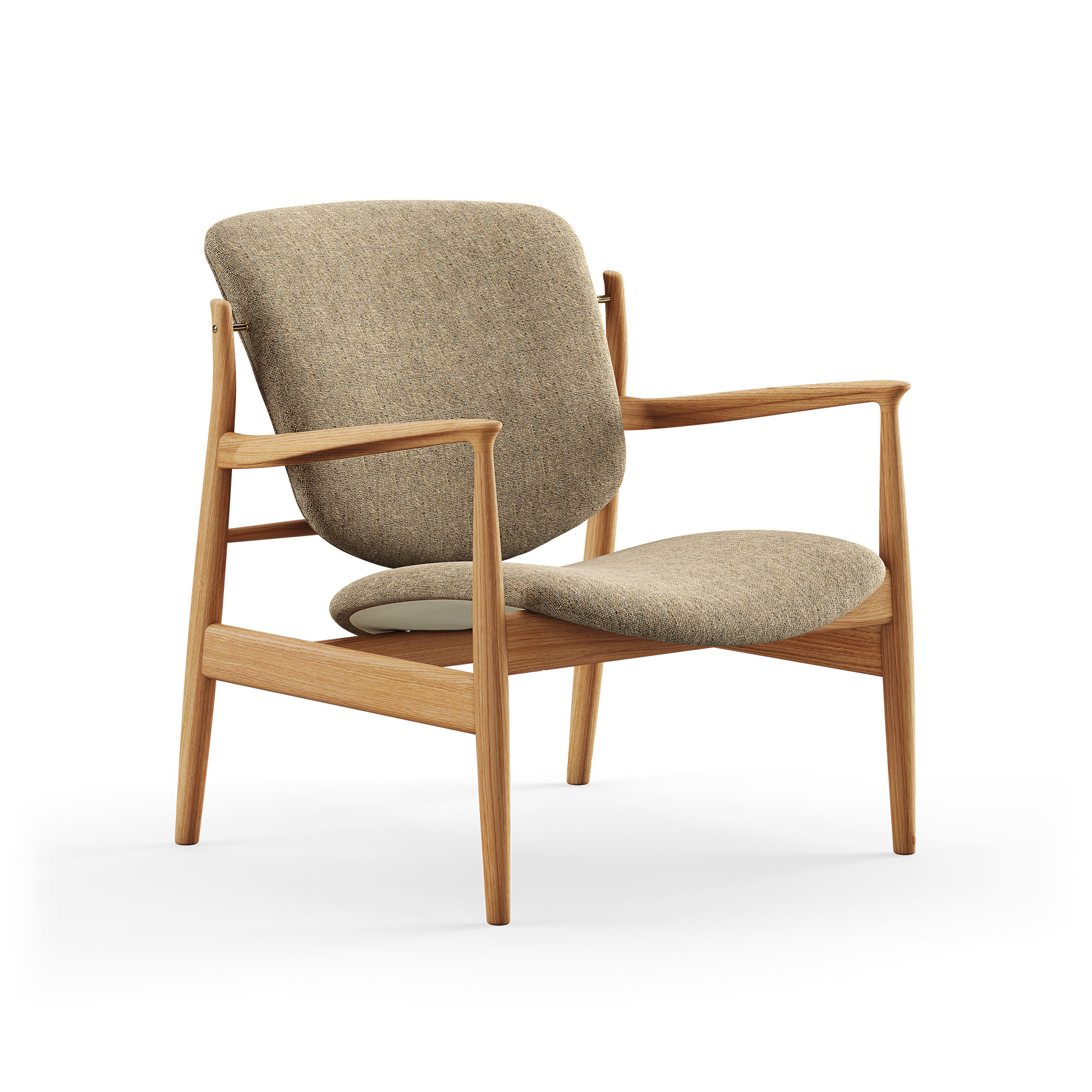 France Chair, även känd under beteckningen FJ 136, är en skapelse från 1956 av designern Finn Juhl. Denna stol är ett tydligt exempel på Juhls distinkta designstil, med en sittdel och ryggstöd som elegant verkar sväva fritt över stolens stomme, samt de anatomiskt anpassade armstöden som också kännetecknar den berömda 45 Chair. Sedan 2016 produceras stolen av House of Finn Juhl och finns tillgänglig i träslagen ek och valnöt. Kunderna kan välja mellan olika typer av handgjorda klädslar i antingen textil eller läder för alla modeller. Ursprungligen skapades France Chair i ett samarbete med möbelföretaget France & Son, specifikt för den amerikanska konsumentmarknaden. Stolen levererades i början som ett platt paket som kunden fick sätta ihop själv, vilket var en central del av France & Sons försäljningskoncept. Detta bidrog till att Finn Juhl och France & Son nådde stora framgångar i USA. Numera skickas stolen dock ut fullständigt ihopsatt. På vår webbplats presenterar vi ett urval av tillgängliga varianter, medan fullständig information om alla modeller finns i vårt produktblad. Om du är intresserad av andra varianter eller behöver assistans med din beställning, tveka inte att kontakta oss.