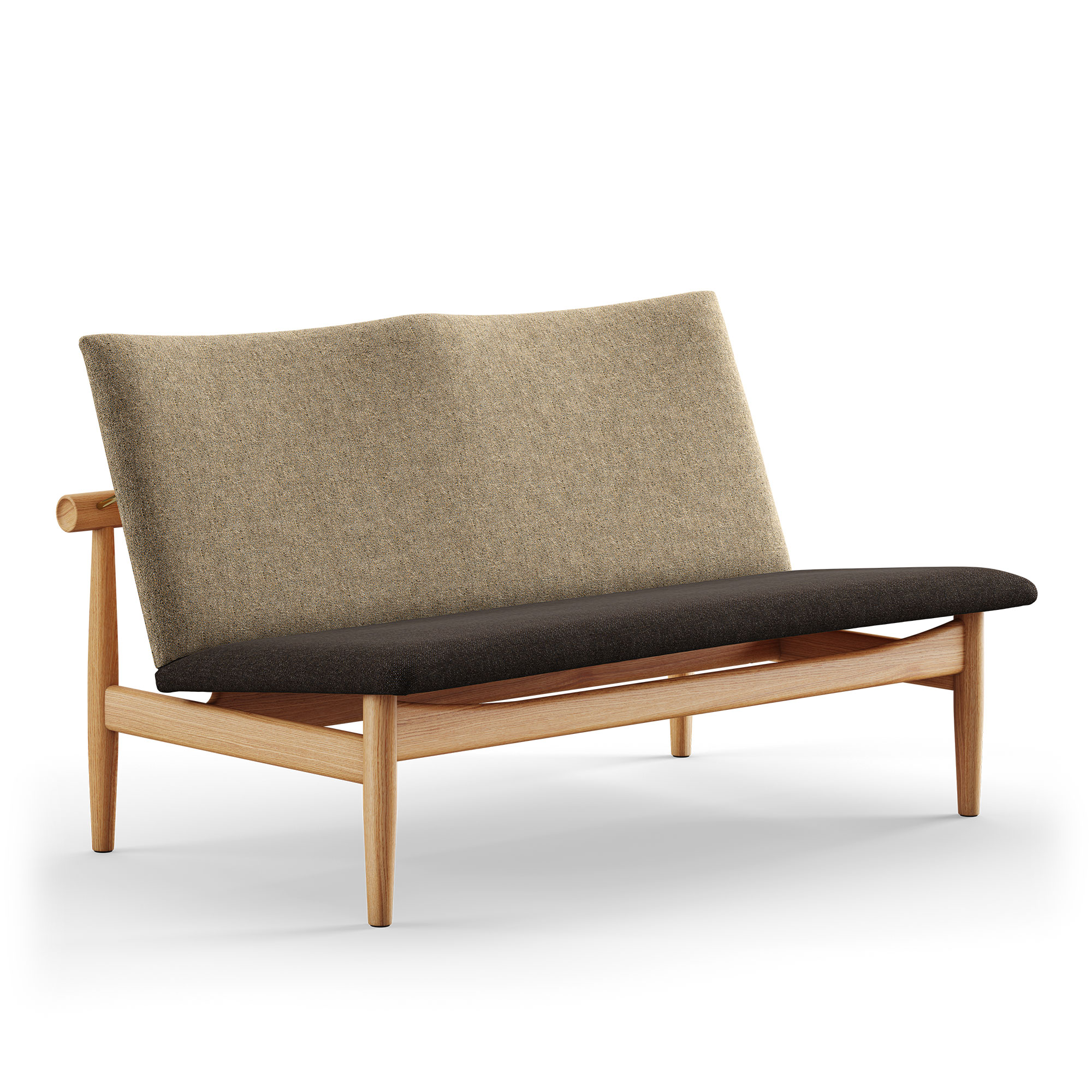 Den tvåsitsiga Japan Sofa är en del av Japan-kollektionen, skapad 1957 av designikonen Finn Juhl. Denna soffa, liksom övriga delar i samlingen, utmärker sig genom sin rena och avskalade design. Inspirationen är hämtad från det traditionella japanska hantverket, vilket återspeglas i soffans formgivning. Dess horisontella ryggstöd, som stöds av koniskt formade ben, anspelar på de klassiska japanska tempeldörrarna. En distinkt rund detalj på ryggstödets ändar bidrar till ett visuellt sofistikerat intryck, vilket är karaktäristiskt för Finn Juhls designfilosofi där han menade att ""detaljerna gör avvikelsen"". Juhl bibehåller sin designprincip om att framhäva kontrasten mellan stödjande och understödda element genom att distinkt separera ryggstödet från soffans huvudstruktur med hjälp av mässingsfästen. Japan Sofa 2-sits är tillgänglig i antingen ek eller valnöt och kläs med en handgjord textilbeklädnad. Denna möbelserie är frukten av ett samarbete mellan Finn Juhl och möbeltillverkaren France & Son, med ambitionen att skapa möbler som var väl anpassade för massproduktion utan att kompromissa med 1950-talets estetiska ideal. House of Finn Juhl återintroducerade Japan Sofa 2-sits och de övriga delarna i serien år 2007. På vår webbplats presenterar vi ett urval av de tillgängliga varianterna, medan fullständiga utföranden kan hittas i vårt produktblad. För ytterligare utföranden eller assistans med din beställning, tveka inte att kontakta oss.