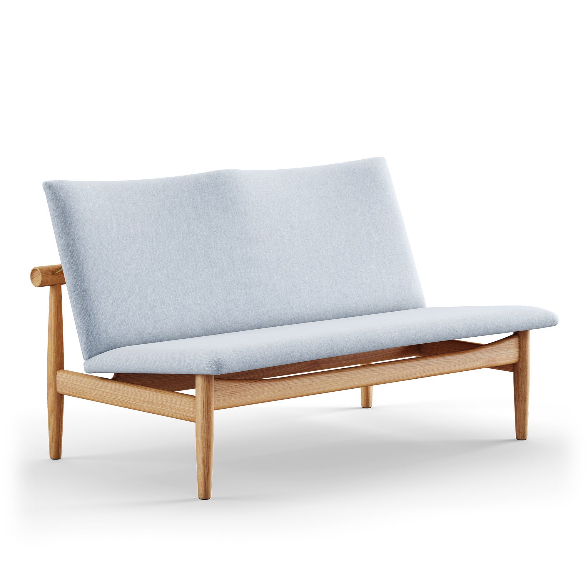 Den tvåsitsiga Japan Sofa är en del av Japan-kollektionen, skapad 1957 av designikonen Finn Juhl. Denna soffa, liksom övriga delar i samlingen, utmärker sig genom sin rena och avskalade design. Inspirationen är hämtad från det traditionella japanska hantverket, vilket återspeglas i soffans formgivning. Dess horisontella ryggstöd, som stöds av koniskt formade ben, anspelar på de klassiska japanska tempeldörrarna. En distinkt rund detalj på ryggstödets ändar bidrar till ett visuellt sofistikerat intryck, vilket är karaktäristiskt för Finn Juhls designfilosofi där han menade att ""detaljerna gör avvikelsen"". Juhl bibehåller sin designprincip om att framhäva kontrasten mellan stödjande och understödda element genom att distinkt separera ryggstödet från soffans huvudstruktur med hjälp av mässingsfästen. Japan Sofa 2-sits är tillgänglig i antingen ek eller valnöt och kläs med en handgjord textilbeklädnad. Denna möbelserie är frukten av ett samarbete mellan Finn Juhl och möbeltillverkaren France & Son, med ambitionen att skapa möbler som var väl anpassade för massproduktion utan att kompromissa med 1950-talets estetiska ideal. House of Finn Juhl återintroducerade Japan Sofa 2-sits och de övriga delarna i serien år 2007. På vår webbplats presenterar vi ett urval av de tillgängliga varianterna, medan fullständiga utföranden kan hittas i vårt produktblad. För ytterligare utföranden eller assistans med din beställning, tveka inte att kontakta oss.