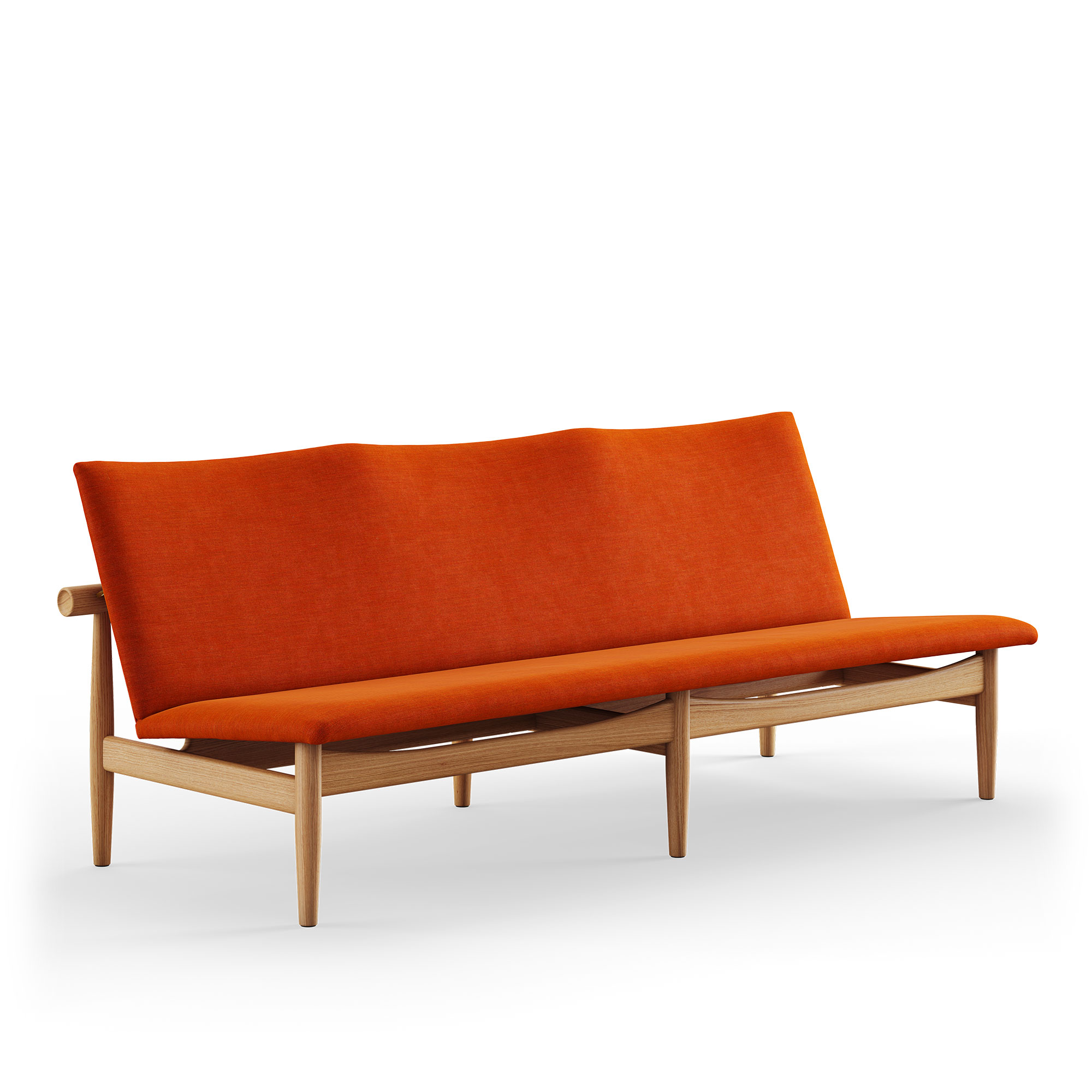 Tre-sitssoffan Japan Sofa, en del av Japan-kollektionen designad av Finn Juhl 1957, utmärker sig genom sin rena och förenklade design, vilket skiljer sig från Juhls tidigare mer komplexa möbelstycken. Denna soffa är inspirerad av det traditionella japanska hantverket och har ett horisontellt ryggstöd i solitt trä som stöds av ben som smalnar av mot ändarna, vilket anspelar på de klassiska tempeldörrarna i Japan. En distinkt rund detalj på ryggstödets ändar bidrar till en visuell elegans och är representativ för Juhls designfilosofi där han menade att ""detaljerna gör skillnaden"". Japan Sofa 3-sits behåller Juhls designprinciper genom att framhäva kontrasten mellan stödjande och understödda delar, där ryggstödet är distinkt separerat från den bärande strukturen med hjälp av mässingsfästen. Soffan produceras i antingen ek eller valnötsträ och kläs med en handsydd textilbeklädnad. Japan Sofa 3-sits och de övriga möblerna i denna kollektion är frukten av ett samarbete mellan Finn Juhl och möbeltillverkaren France & Son, med målet att skapa en möbelserie som var väl anpassad för massproduktion utan att kompromissa med 1950-talets designideal. År 2007 beslutade House of Finn Juhl att återintroducera Japan Sofa 3-sits tillsammans med resten av möbelserien. På vår webbplats presenterar vi ett urval av de tillgängliga varianterna, medan fullständiga utföranden och specifikationer finns i vårt produktblad. För ytterligare utföranden eller assistans med din beställning, tveka inte att kontakta oss.