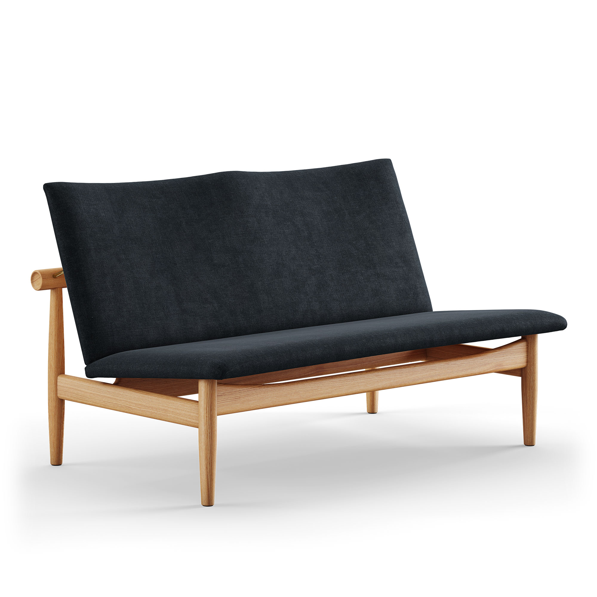 Den tvåsitsiga Japan Sofa är en del av Japan-kollektionen, skapad 1957 av designikonen Finn Juhl. Denna soffa, liksom övriga delar i samlingen, utmärker sig genom sin rena och avskalade design. Inspirationen är hämtad från det traditionella japanska hantverket, vilket återspeglas i soffans formgivning. Dess horisontella ryggstöd, som stöds av koniskt formade ben, anspelar på de klassiska japanska tempeldörrarna. En distinkt rund detalj på ryggstödets ändar bidrar till ett visuellt sofistikerat intryck, vilket är karaktäristiskt för Finn Juhls designfilosofi där han menade att ""detaljerna gör avvikelsen"". Juhl bibehåller sin designprincip om att framhäva kontrasten mellan stödjande och understödda element genom att distinkt separera ryggstödet från soffans huvudstruktur med hjälp av mässingsfästen. Japan Sofa 2-sits är tillgänglig i antingen ek eller valnöt och kläs med en handgjord textilbeklädnad. Denna möbelserie är frukten av ett samarbete mellan Finn Juhl och möbeltillverkaren France & Son, med ambitionen att skapa möbler som var väl anpassade för massproduktion utan att kompromissa med 1950-talets estetiska ideal. House of Finn Juhl återintroducerade Japan Sofa 2-sits och de övriga delarna i serien år 2007. På vår webbplats presenterar vi ett urval av de tillgängliga varianterna, medan fullständiga utföranden kan hittas i vårt produktblad. För ytterligare utföranden eller assistans med din beställning, tveka inte att kontakta oss.