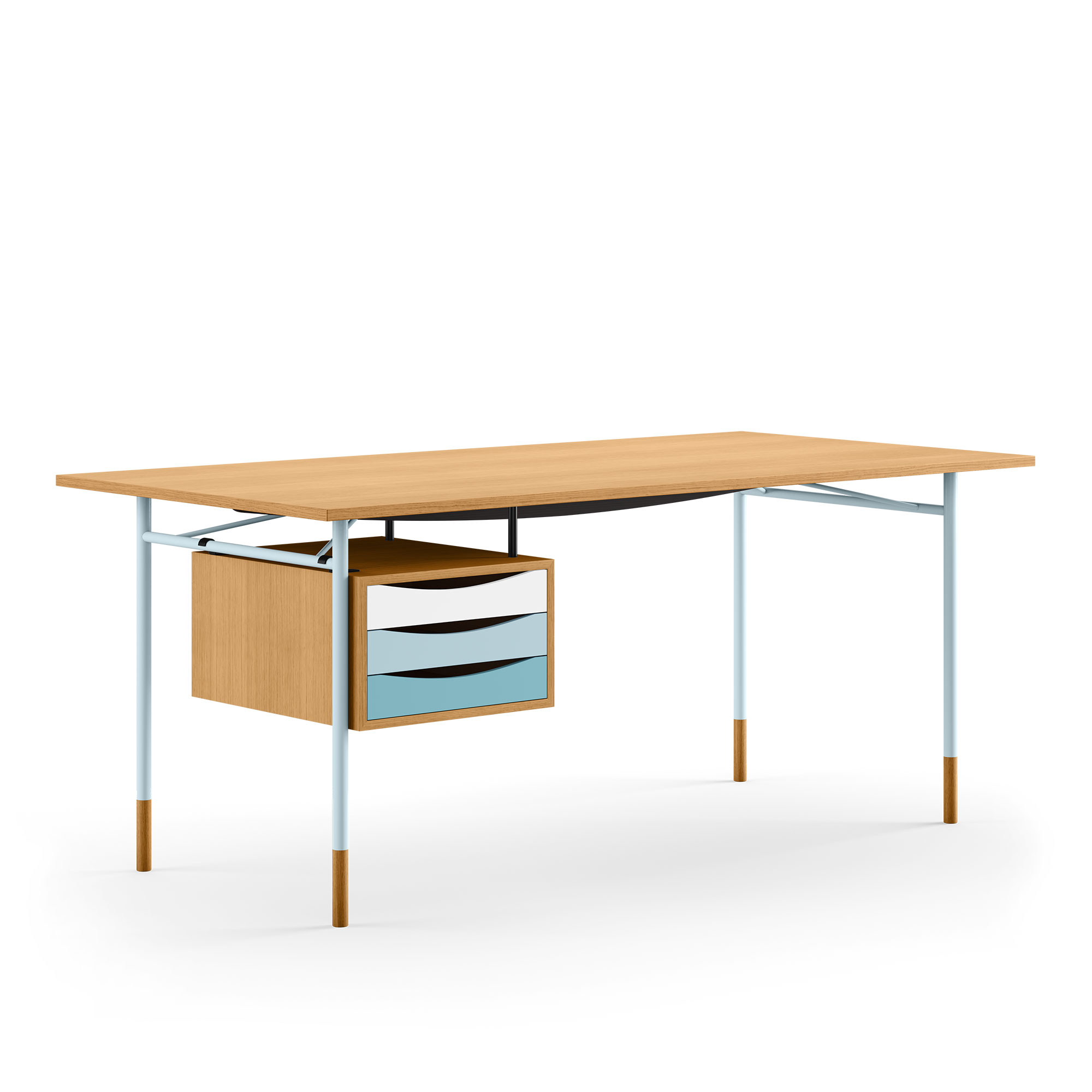 House of Finn Juhl - Nyhavn Desk, 190 cm, with Tray Unit, Oak Dark Oil, Light Blue Steel, Cold - Skrivbord - Finn Juhl - Träfärgad,Blå - Metall/Trä