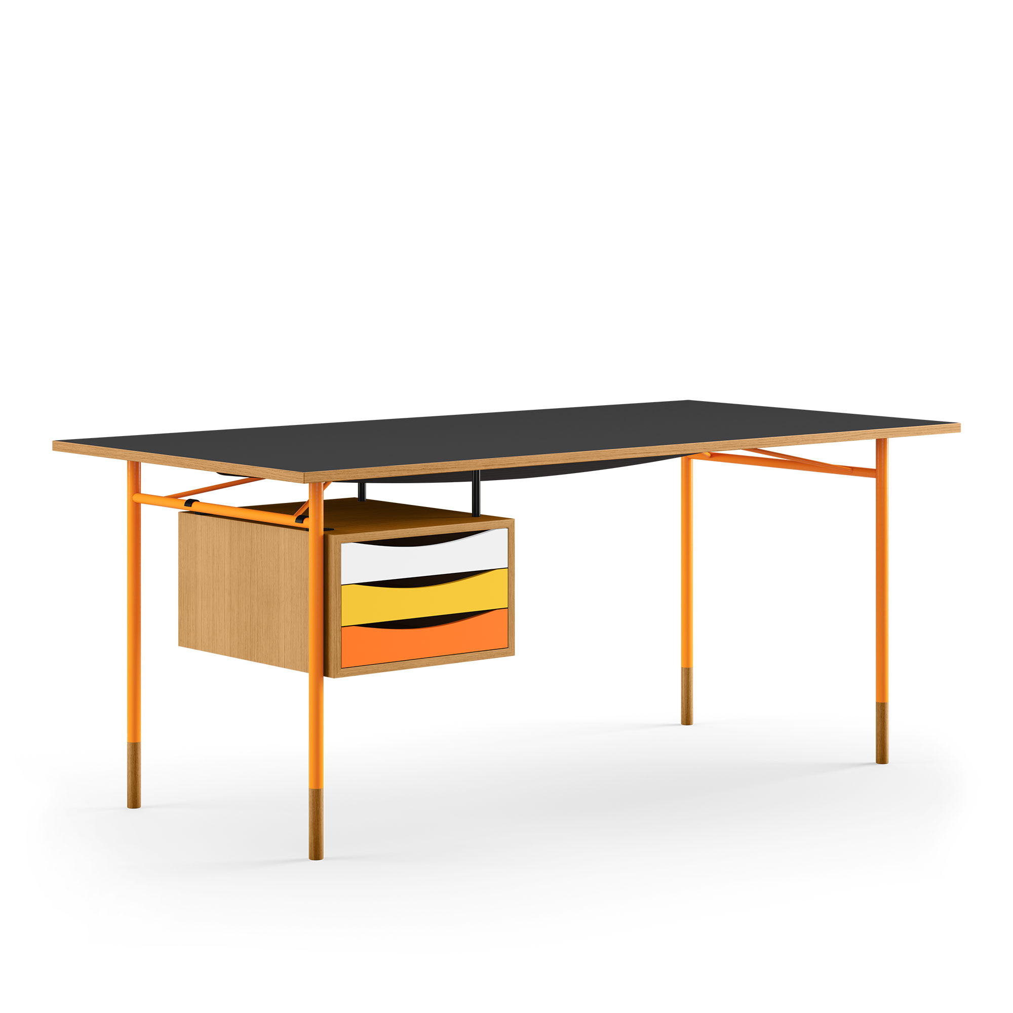 House of Finn Juhl - Nyhavn Desk, 190 cm, with Tray Unit, Oak Dark Oil/Black linoleum, Orange Steel, Warm - Skrivbord - Finn Juhl - Orange,Träfärgad,Svart - Metall/Trä