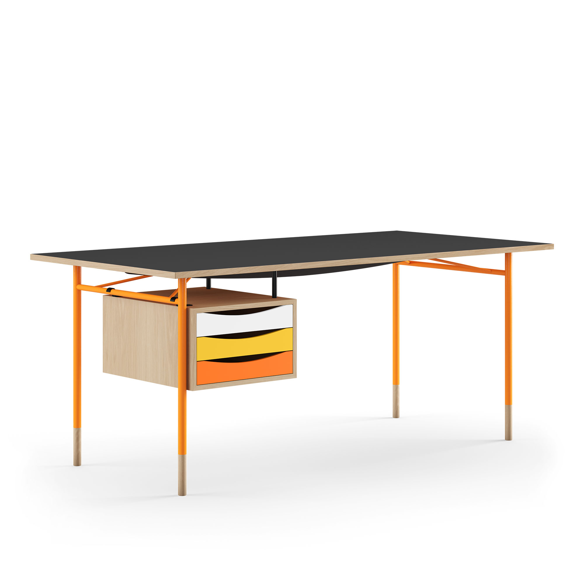 House of Finn Juhl - Nyhavn Desk, 190 cm, with Tray Unit, Oak, Orange Steel, Warm - Skrivbord - Finn Juhl - Orange,Träfärgad,Svart - Metall/Trä