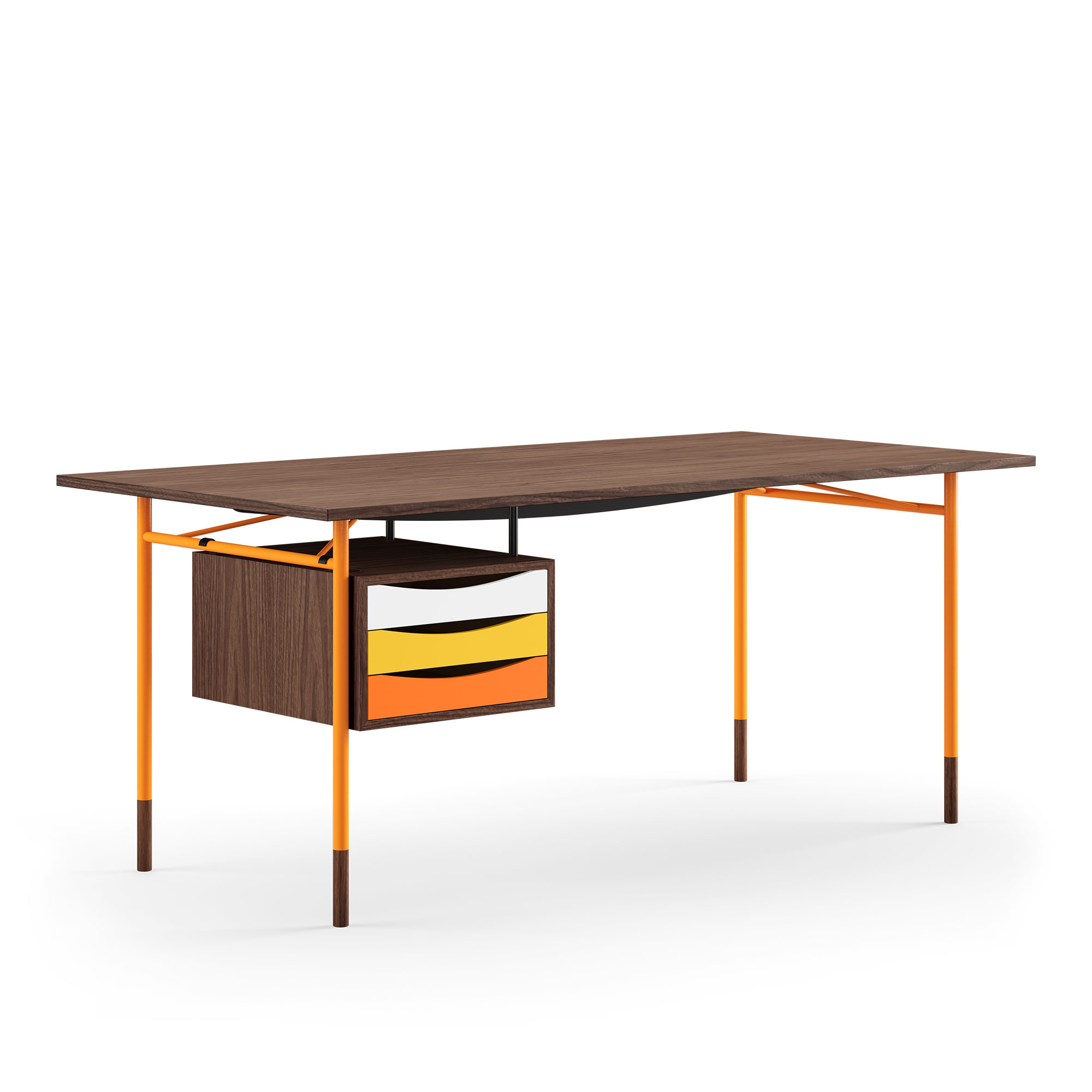 House of Finn Juhl - Nyhavn Desk, 190 cm, with Tray Unit, Walnut Dark Oil, Orange Steel, Warm - Skrivbord - Finn Juhl - Orange,Träfärgad - Metall/Trä
