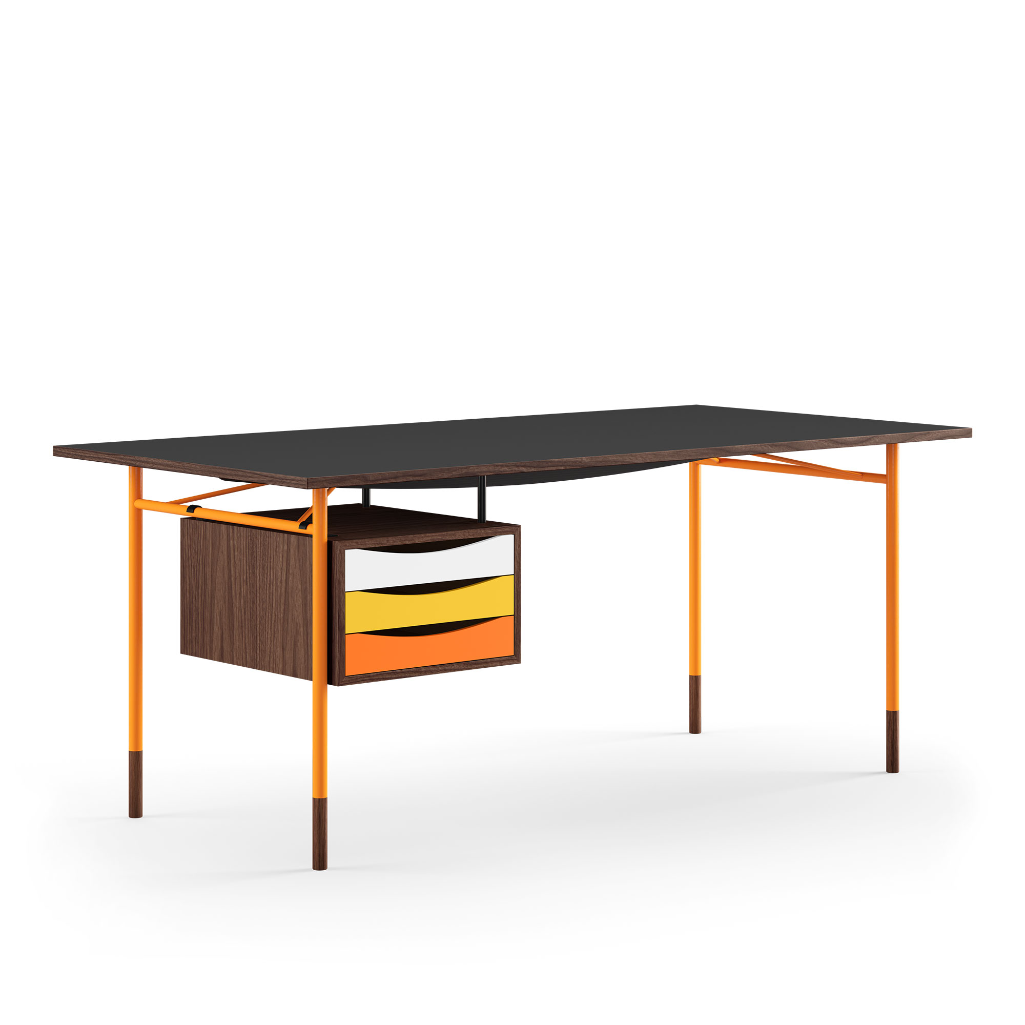 House of Finn Juhl - Nyhavn Desk, 190 cm, with Tray Unit, Walnut, Orange Steel, Warm - Skrivbord - Finn Juhl - Orange,Träfärgad,Svart - Metall/Trä