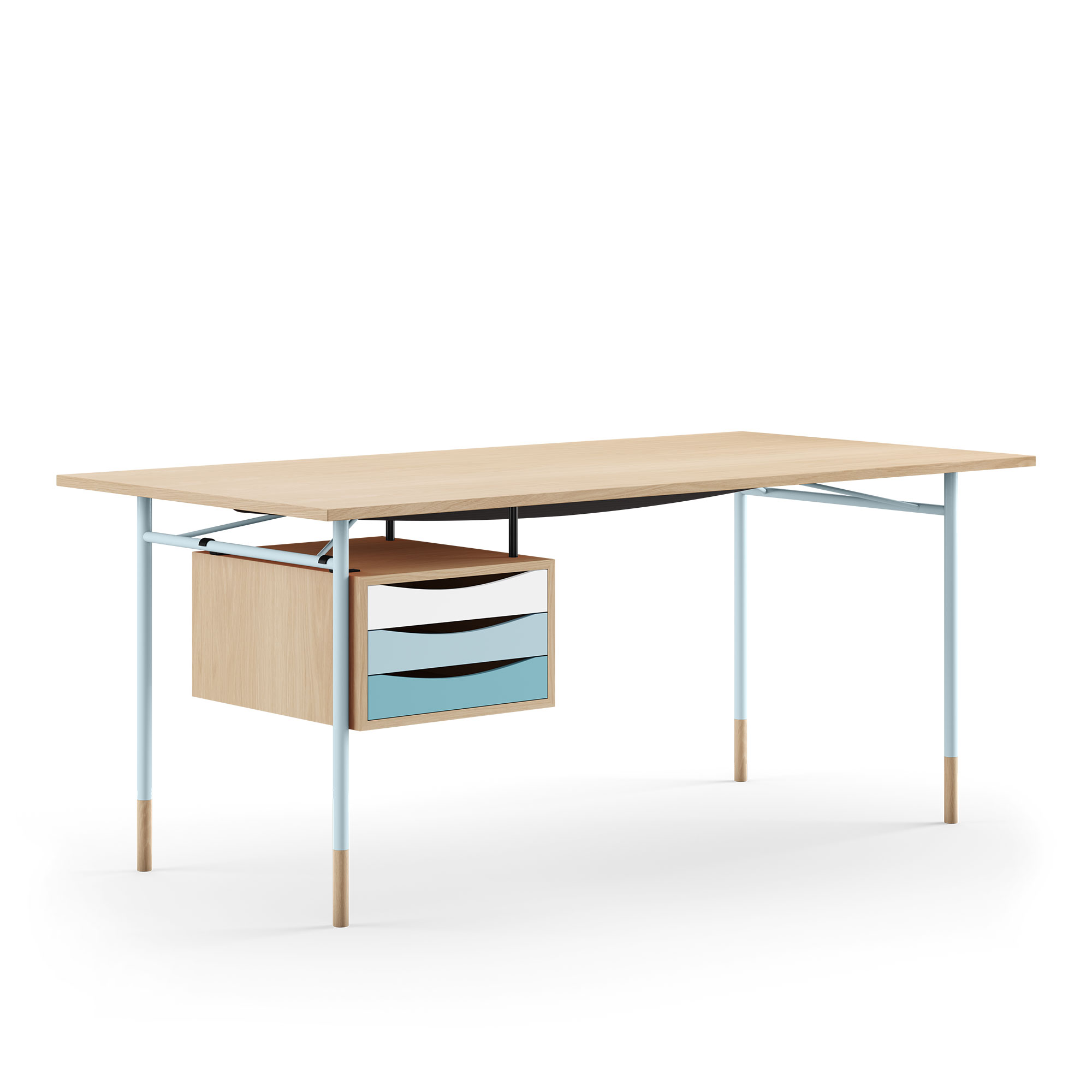 House of Finn Juhl - Nyhavn skrivbord 170 cm Cold med lådor Oak Clear oil Light Blue Steel Cold - Skrivbord - Finn Juhl - Träfärgad,Blå - Metall/Trä
