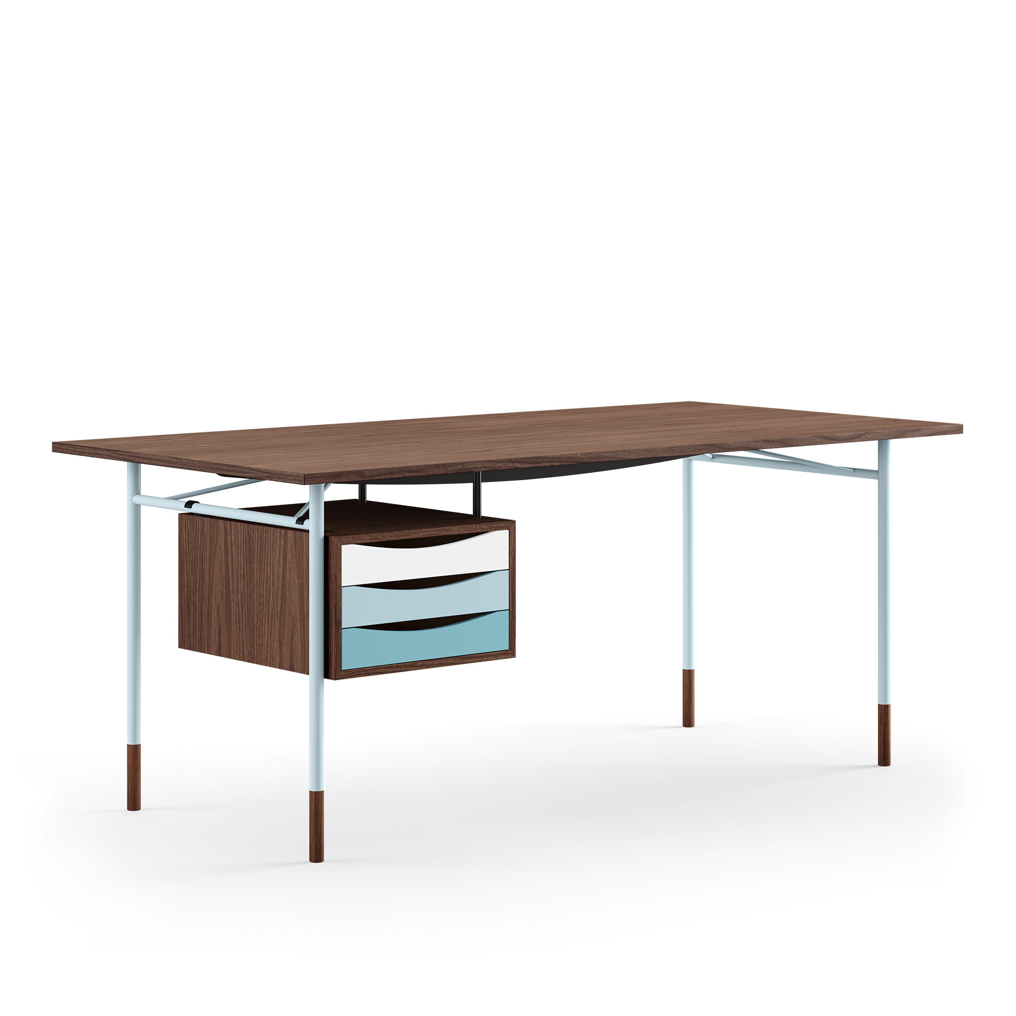 House of Finn Juhl - Nyhavn skrivbord 170 cm Cold med lådor Walnut Dark Oil Light Blue Steel Cold - Skrivbord - Finn Juhl - Träfärgad,Blå - Metall/Trä