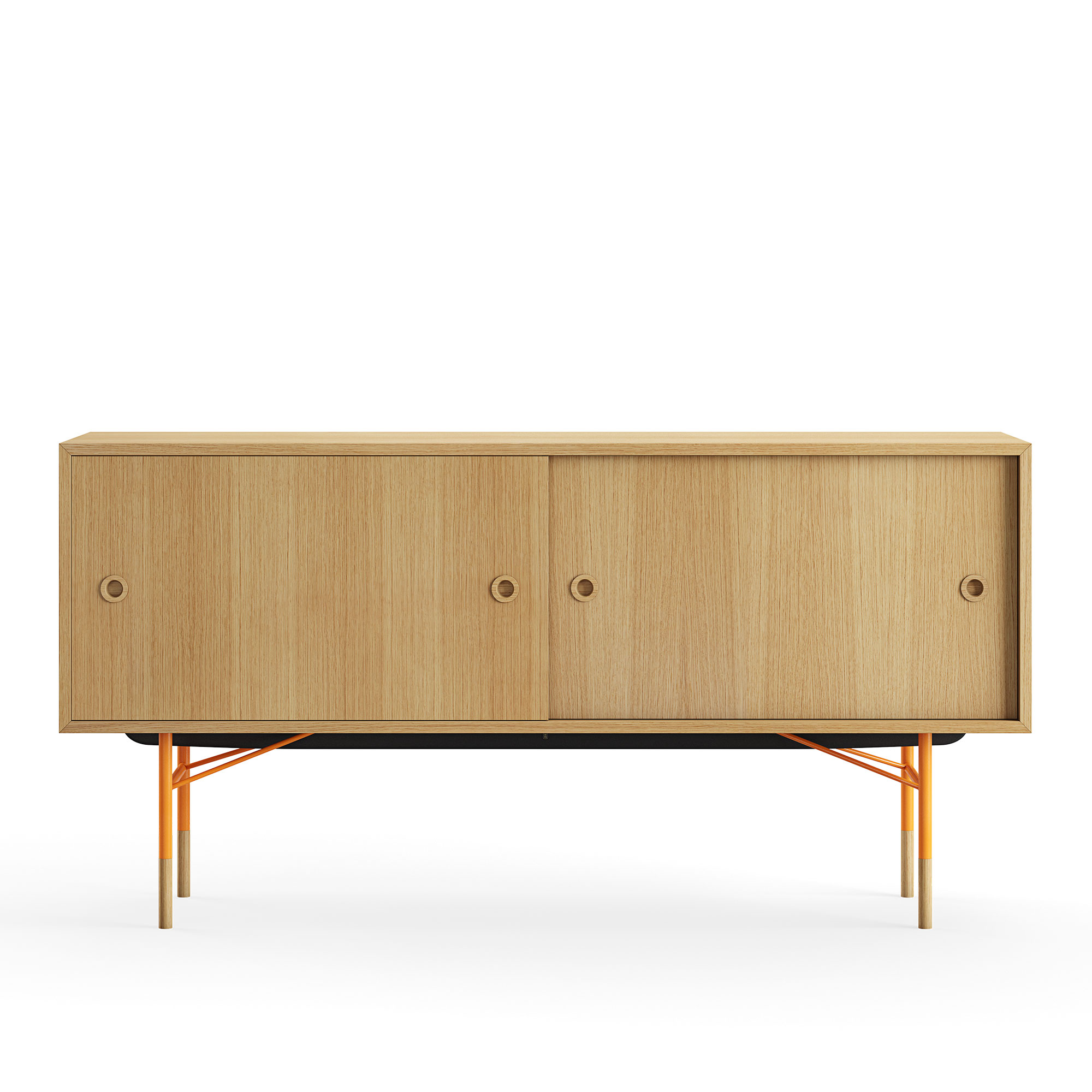 Sideboardet utan lådor, designat av Finn Juhl 1955, har återupptagit sin produktion sedan 2012 genom House of Finn Juhl. Denna eleganta förvaringsenhet förenar utvalda trämaterial med kulörer inspirerade av Goethes vetenskapliga arbete ""Zur Farbenlehre"", som först diskuterade färgernas essens. Sideboardet är konstruerat med faner i antingen ek eller valnöt. Dess glidande dörrar finns i faner eller målade i vitt och gult eller vitt och ljusblått. Dess ram är tillgänglig i lackerat stål i färgerna svart, orange eller ljusblått, med ben i trä. Finn Juhl, som hade etablerat sitt rykte i USA under tidigt 1950-tal, blev alltmer påverkad av sina amerikanska samtida, särskilt av paret Eames. Medan trä tidigare varit det primära materialet i Juhls design, började han nu utforska stål som material. Sideboardet utan lådor är ett utmärkt exempel på denna nya enkelhet med rena linjer och kombinationen av trä och metall. På vår webbplats presenterar vi ett urval av tillgängliga varianter, men ytterligare alternativ kan du hitta i vårt produktblad. Om du önskar en annan variant eller behöver hjälp med din beställning, tveka inte att kontakta oss.