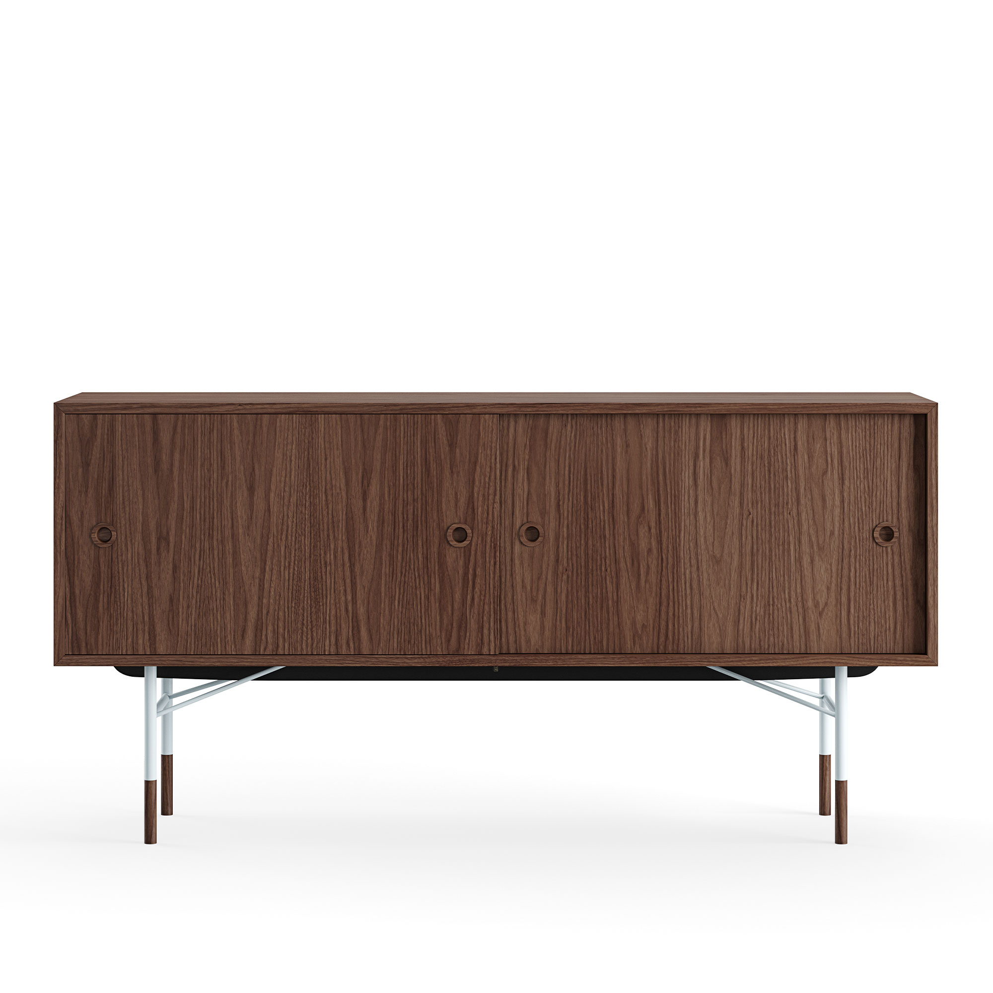Sideboardet utan lådor, designat av Finn Juhl 1955, har återupptagit sin produktion sedan 2012 genom House of Finn Juhl. Denna eleganta förvaringsenhet förenar utvalda trämaterial med kulörer inspirerade av Goethes vetenskapliga arbete ""Zur Farbenlehre"", som först diskuterade färgernas essens. Sideboardet är konstruerat med faner i antingen ek eller valnöt. Dess glidande dörrar finns i faner eller målade i vitt och gult eller vitt och ljusblått. Dess ram är tillgänglig i lackerat stål i färgerna svart, orange eller ljusblått, med ben i trä. Finn Juhl, som hade etablerat sitt rykte i USA under tidigt 1950-tal, blev alltmer påverkad av sina amerikanska samtida, särskilt av paret Eames. Medan trä tidigare varit det primära materialet i Juhls design, började han nu utforska stål som material. Sideboardet utan lådor är ett utmärkt exempel på denna nya enkelhet med rena linjer och kombinationen av trä och metall. På vår webbplats presenterar vi ett urval av tillgängliga varianter, men ytterligare alternativ kan du hitta i vårt produktblad. Om du önskar en annan variant eller behöver hjälp med din beställning, tveka inte att kontakta oss.