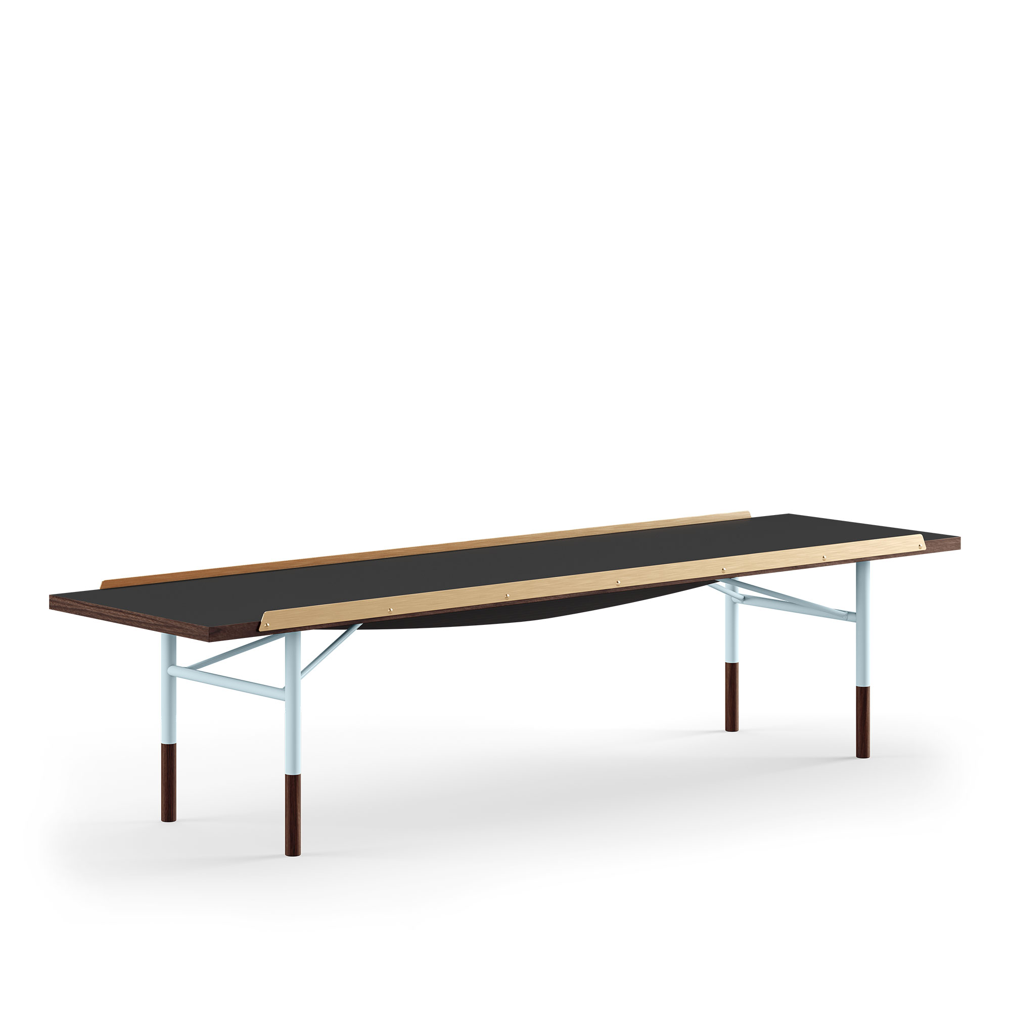 House of Finn Juhl - Table Bench Medium, With Brass Edges, Walnut/black linoleum, Light Blue Steel - TV-bänkar - Finn Juhl - Träfärgad,Svart,Blå - Metall/Trä/Plast