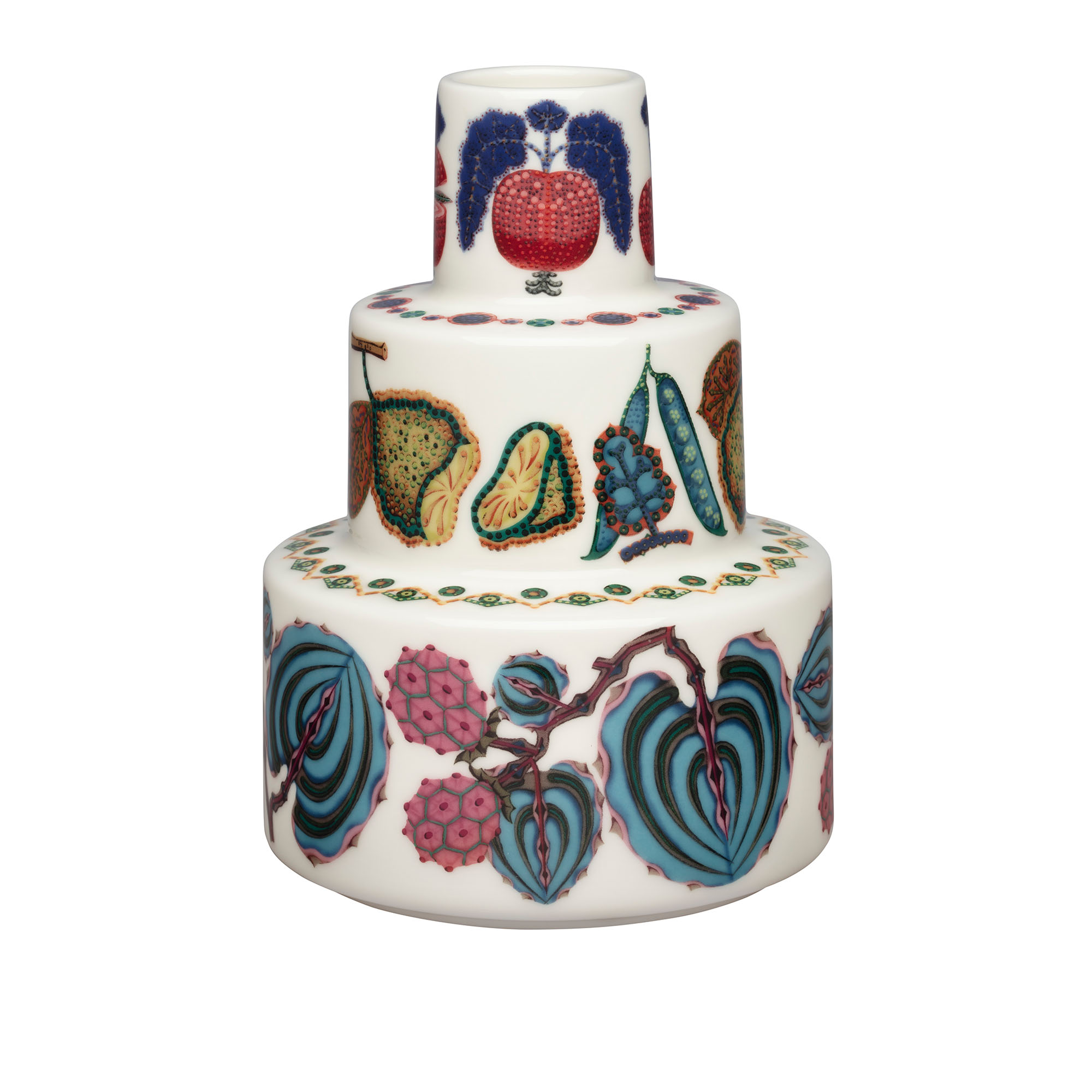 Taika Sato Vas 130 x 180 mm från finska Iittala är ett vackert komplement till alla inredningsstilar. Med sin skulpturella design fungerar den som en fängslande mittpunkt för att visa upp säsongens blommor och kvistar. Det förtrollande mönstret av frukter och grönsaker, inspirerat av bildkonstens stilleben, framhäver vasens form. Vasen är en vacker presentidé till alla typer av festligheter för nära och kära.