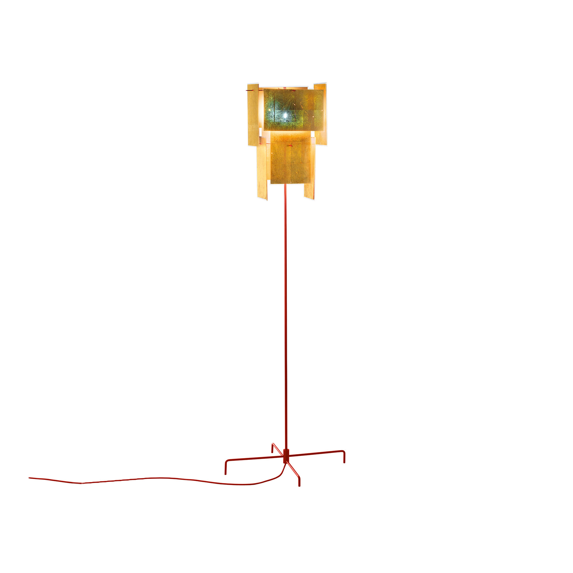 Golvlampan 24 Karat Blau Floor är ett verk av designern Axel Schmid, skapat för Ingo Maurer. Denna belysningsarmatur är sammansatt av åtta bladguldspaneler som är handtillverkade i Japan genom en distinkt metod där de extremt tunna guldpanelerna infogas i akrylmaterial. Var och en av de åtta lampskärmarna är försedda med fyra hål för montering, vilket möjliggör att de kan fästas på lampans metallstång i olika positioner. Både kabeln och metallstångarna är utformade i en attraktiv röd nyans. Den här golvlampan är en del av 24 Karat Blau-serien, som även inkluderar modellerna 1000 Karat Blau, 24 Karat Blau T, 24 Karat Blau M, 24 Karat Blau Wall och 24 Karat Blau. Varje armatur i denna serie utstrålar ett mjukt och inbjudande ljus. Med sin lyxiga design är 24 Karat Blau Floor perfekt för användning i vardagsrum, matsalar, samt i exklusiva miljöer som restauranger och barer.