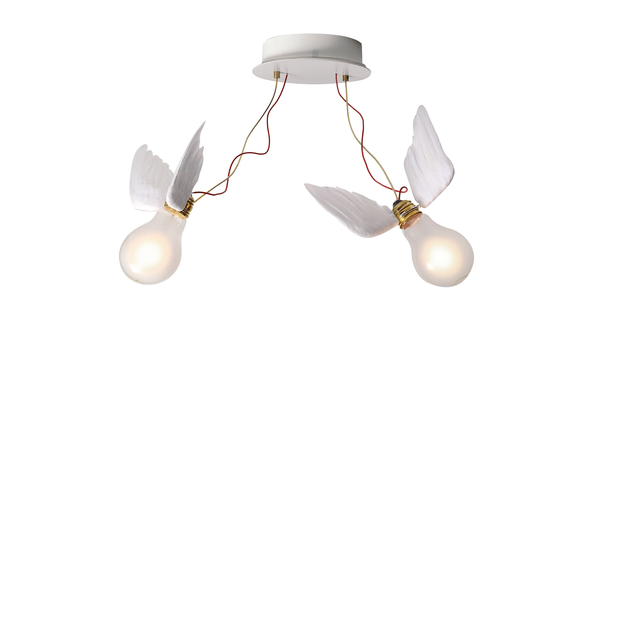 Lucellino Doppio är en taklampa som är designad av det tyska varumärket Ingo Maurer. Taklampan Lucellino Doppio är tillverkad av en kombination av glas, mässing, plast och handgjorda vingar i gåsfjädrar. Denna specialla design är utformad med två lampor som har två vingar på vardera sida med ståltrådar i röd och guldfärg som stöds av ett vitbaserat ramverk. Lampan introducerades för första gången 1992 och har samlat på sig en hel del anmärkningar sedan dess. Med sin intrikata utformning kan denna armatur vara det perfekta sättet att lägga till atmosfär och glamour till vilken inredning som helst. Kombinationen av glas, metall och fjädrar skapar en unik estetik samt en ljuskälla som ger ett behagligt sken i rummet.